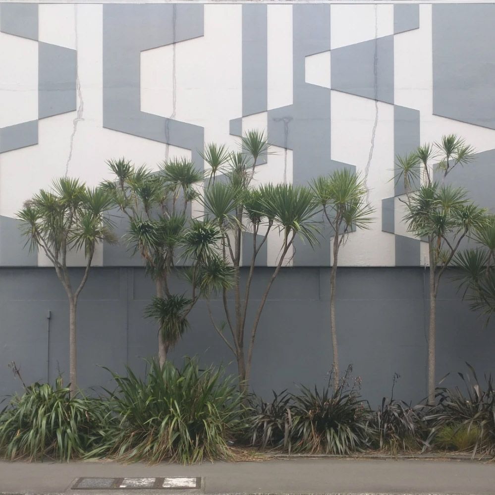 Ngan’s mural, with its geometric vertical elements, disrupts the horizontal, windowless length of Thordon Quay façade, while also providing a graceful visual link between the larger building and the wedge. Taking up an entire wall, the inch-deep shapes are painted a dramatic grey and white.
