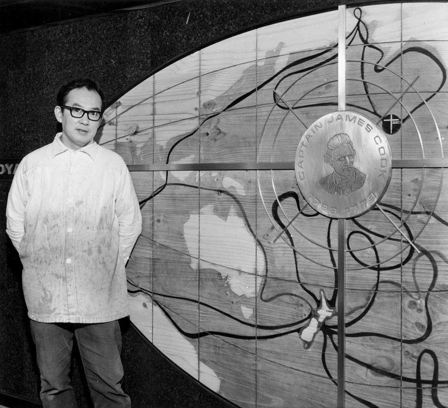Guy Ngan, 'Pacific Voyages [Cook Bicentenary Mural]' (1969) [photographed with artist], CBD, Tairāwhiti Gisborne.