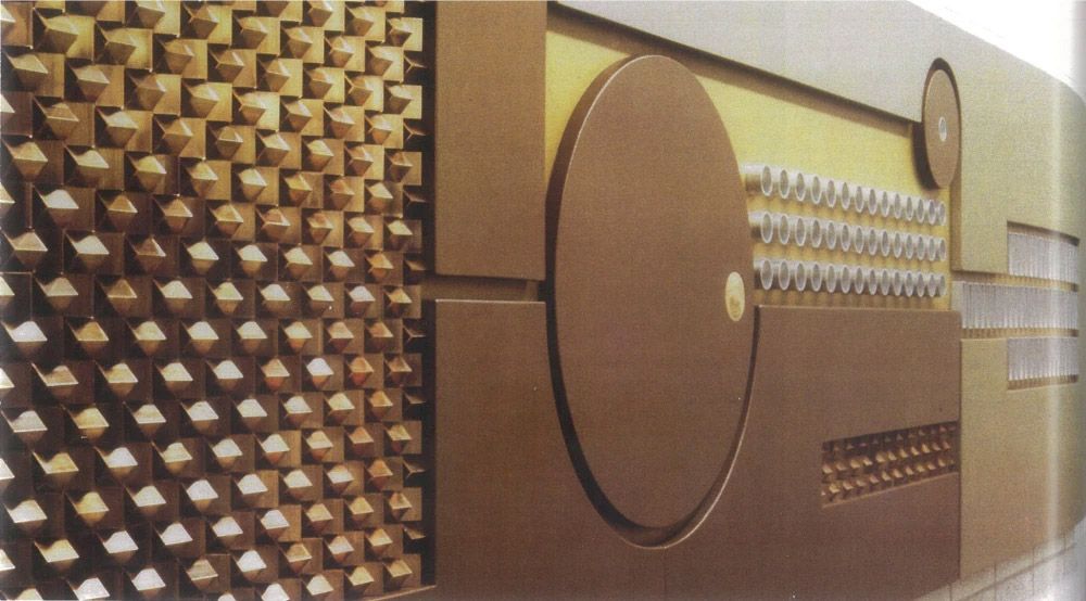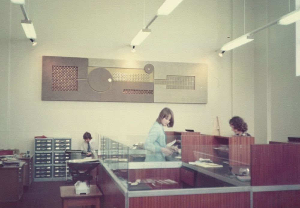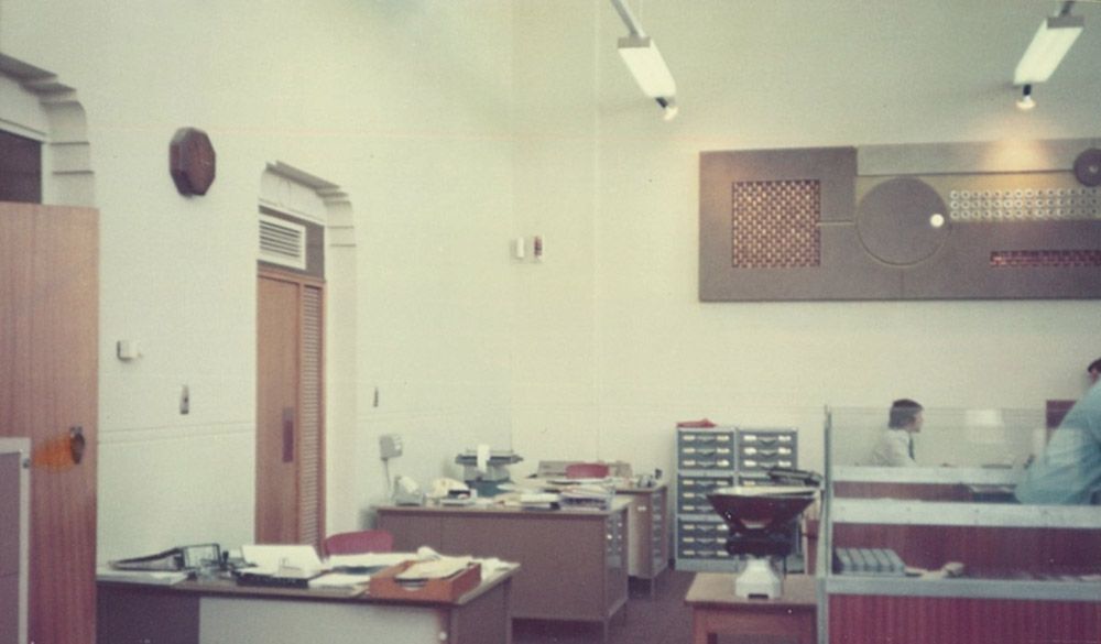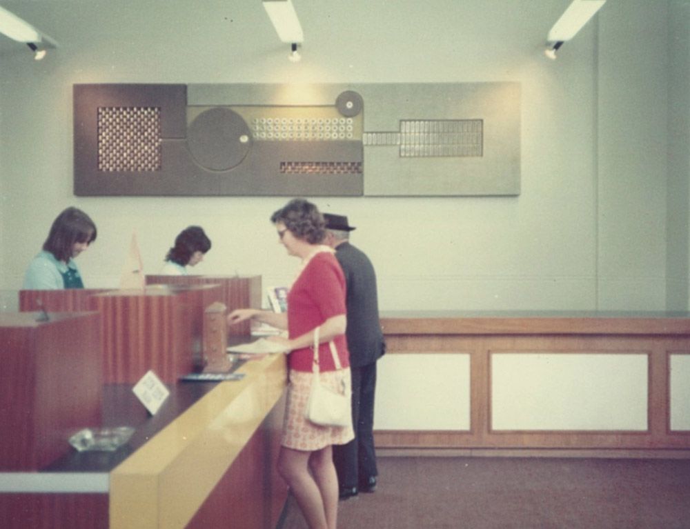 Source: 'Guy Ngan’s artwork in the Morrinsville Branch interior, The National Bank of New Zealand Ltd, 1974. ANZ New Zealand Archives. Ref: P04974-01'
