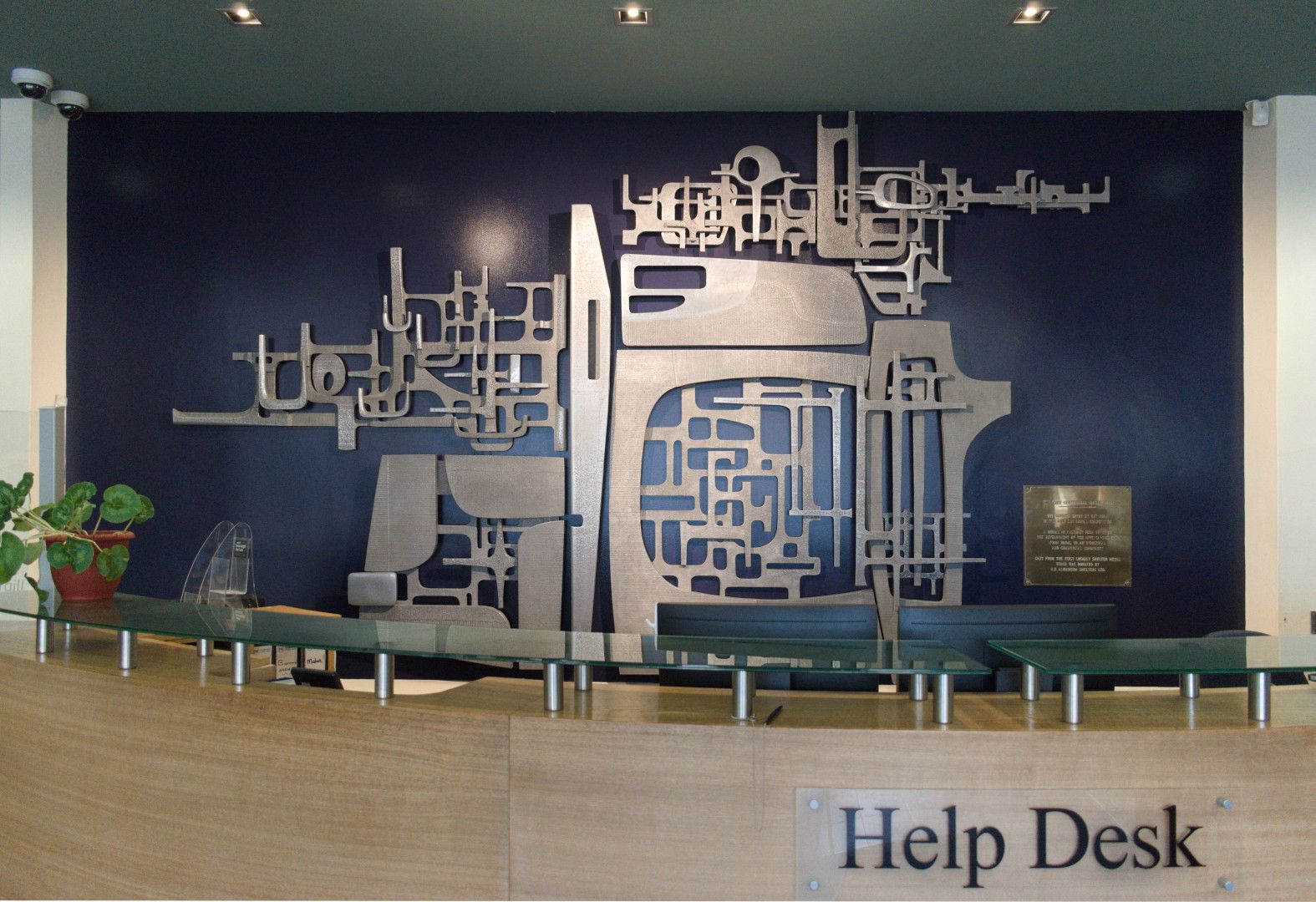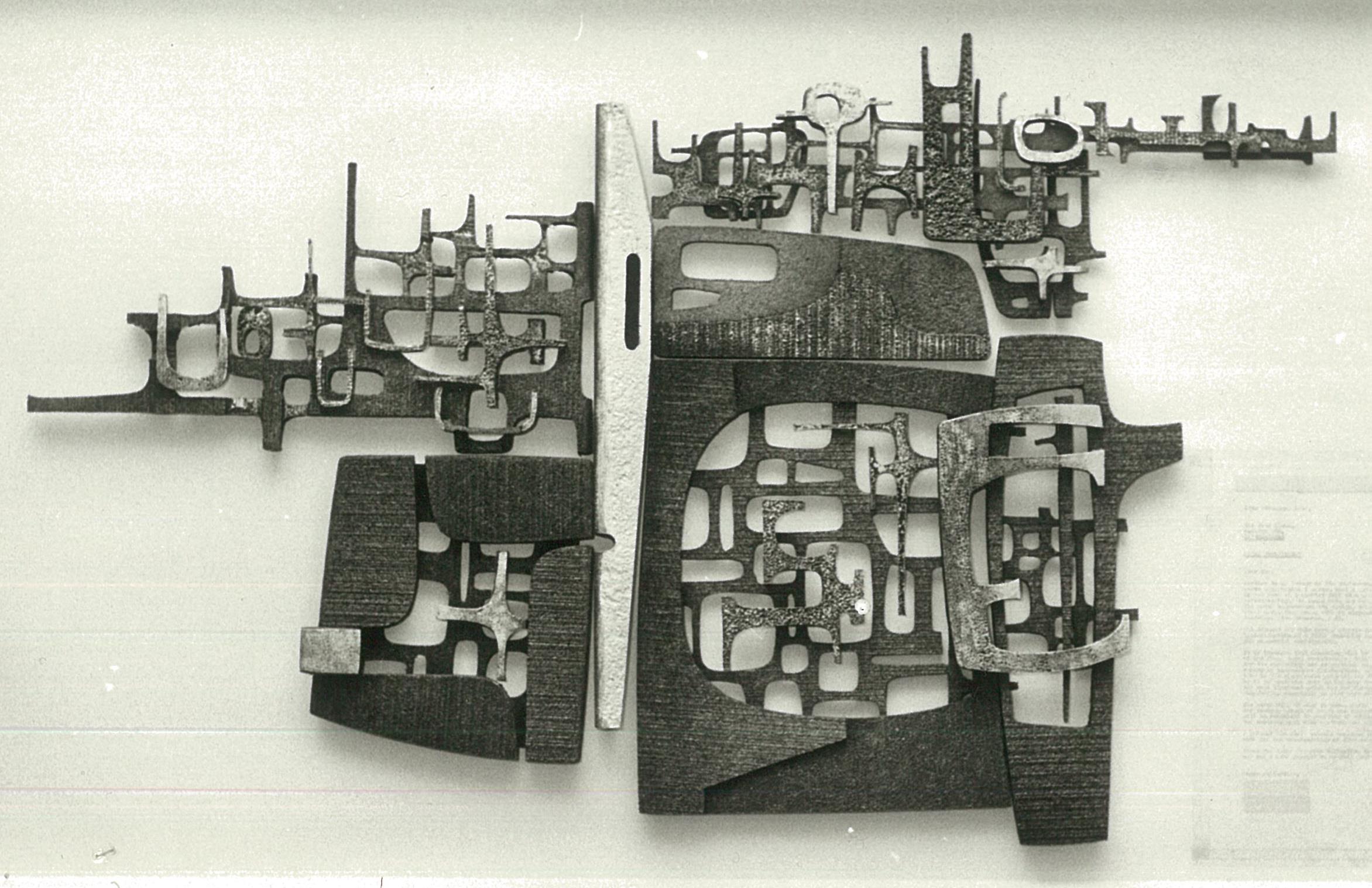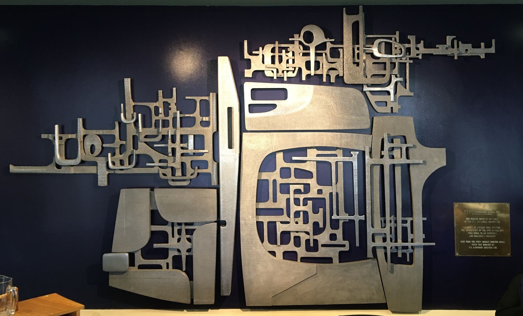 "The City Centennial Mural 1971 / The winning entry by Guy Ngan in the City Centennial Competition / A mural in abstract form depicting the development of the Invercargill City from Rural to an Industrial and Commercial Community / Cast from the first locally smelted metal which was donated by N.Z. Aluminium Smelters Ltd."