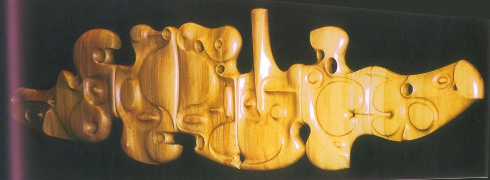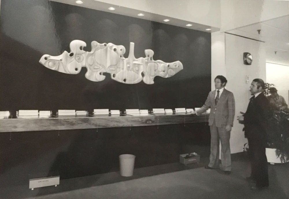 Guy Ngan created both a kahikatea carving and mural (medium uncertain) for a temporary Bank of New Zealand branch on Queen St, which had been set up while the main branch was undergoing alterations. The carving was inspired by the Auckland landscape with its volcanic cones and craters. The mural consisted of at least four panels and was installed directly opposite the woodcarving.