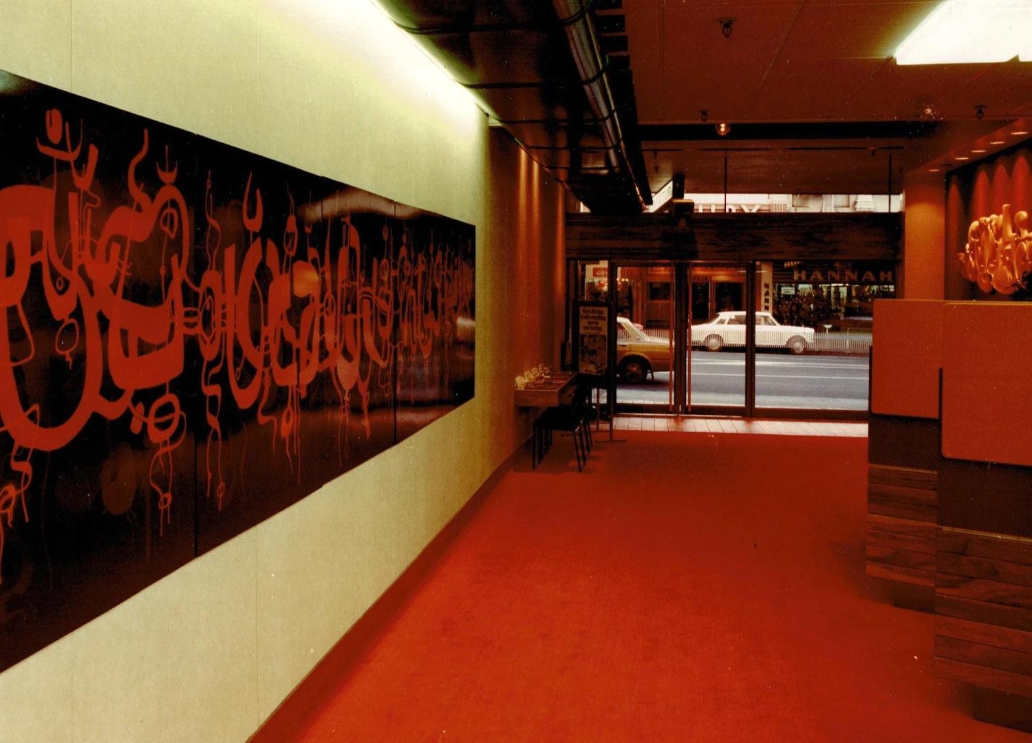 Guy Ngan, 'Untitled [BNZ Queen Street]' (1973), BNZ Queen St Branch mural (left wall) and carving (right wall)], CBD, Tāmaki Makaurau Auckland