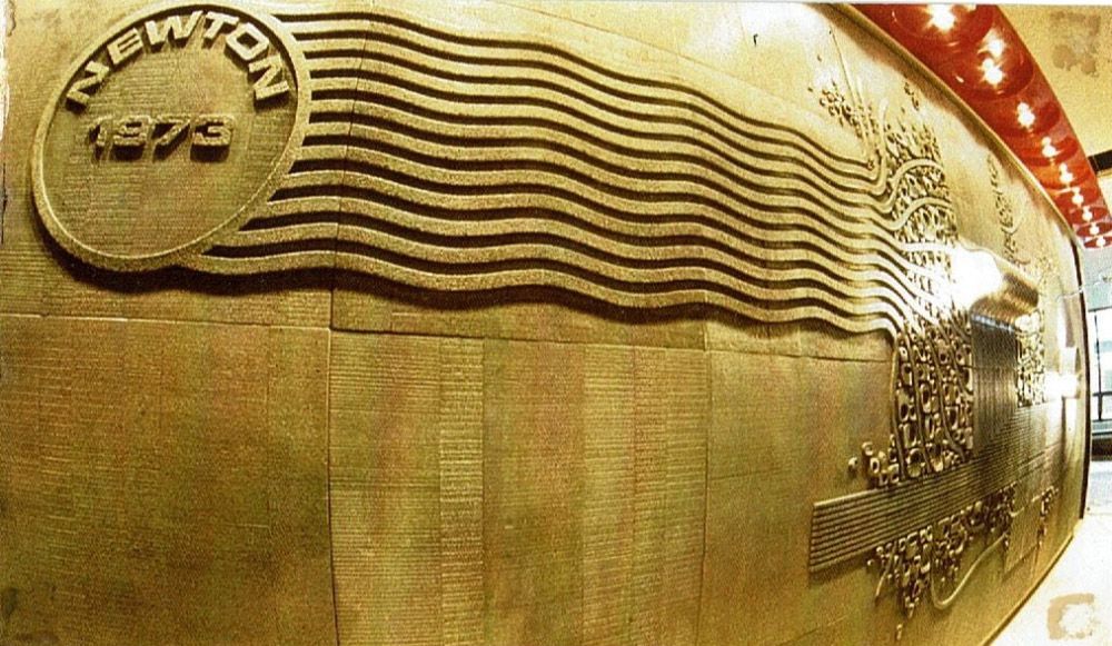 Depicting postal and telegraphic communication, the 'Post Office Mural’s' semi-abstraction typifies modernist-inspired public art of the period. From the left, wavy lines emanating from a postmark bearing the words “Newton 1973” in Eurostyle font (favourite of late modernist architects everywhere) diverge into what could read as roads or telephone lines. The lines snake through a cluster of lozenge forms – houses, stylised letters or perhaps packets of information – before shooting out beyond the abstracted conurbation.