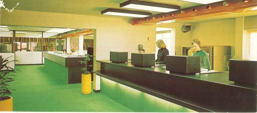 Alongside Ngan’s mural, a number of other artworks were featured as part of the branch fitout including “two colourful smaller murals woven of wool, one by Guy Ngan’s wife, Jean, and the other by Wellington weaver, Jenny Hunt, of Days Bay”, and two pots by Doreen Blumhardt.
