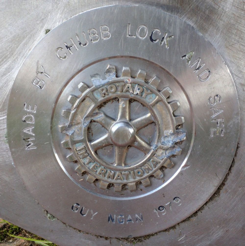 A plaque on the sculpture is inscribed "Made by Chubb Lock and Safe" and "Guy Ngan 1979" around the Rotary International emblem (see photo in More images).