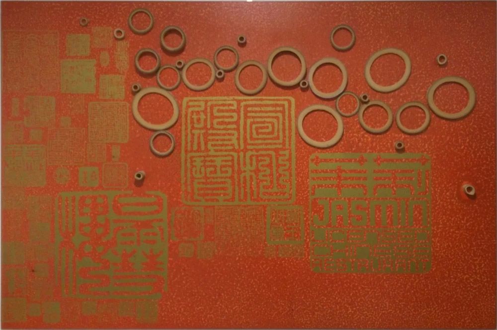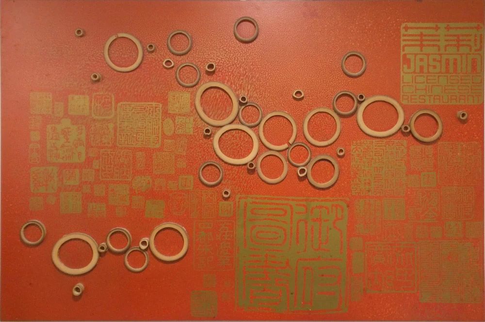 During the early eighties Ngan completed the interior design and branding of the new Jasmin Licensed Chinese Restaurant. His creative contribution was extensive and included floor plans, designs for the restaurant’s brand/logo, interior décor (including colour scheme and furniture manufactured by Formway), silk-screen printed room divider panels, and a mixed-media painting diptych.