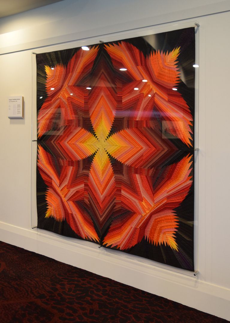 “Inspired by the Pineapple Log Cabin pattern, artist Gwen Wanigasekera developed this quilted piece work from a small sketch, translated onto graph paper and transposed onto vilene sewing the fabric in reverse. Made of cotton, chintz, satins and silks, the fabrics were hand dyed to achieve the desired shades of colours.