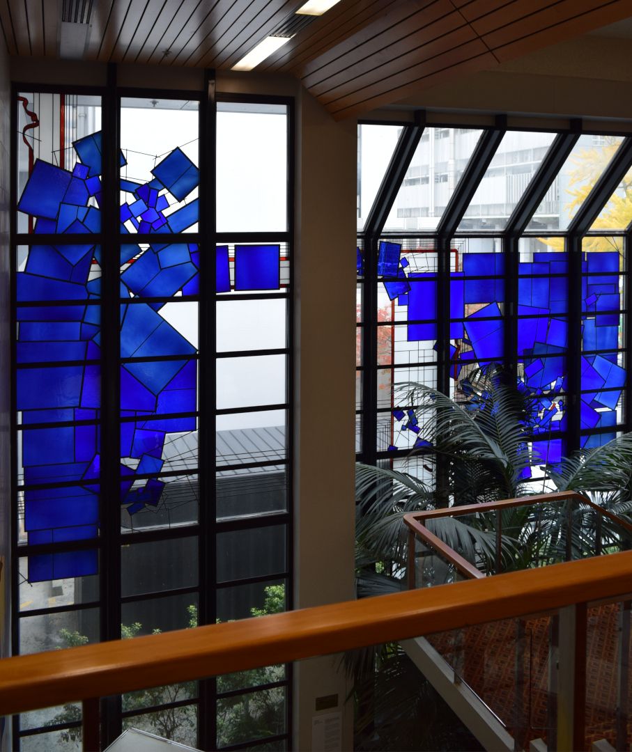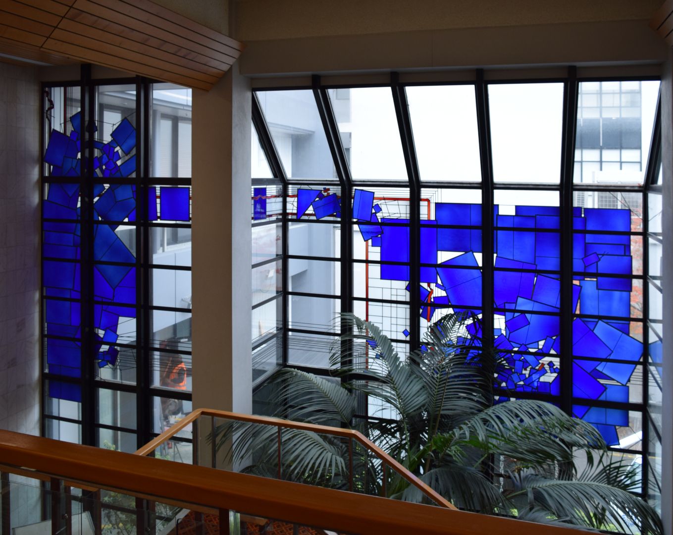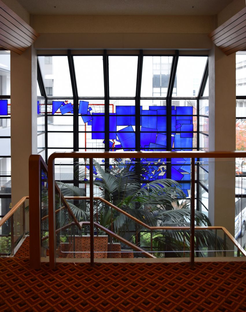 Sanford’s design includes overlapping panels of blue and sporadic splashes of red with transparent glass separating two large areas of blue. This is her visual interpretation of municipality and industry: people cooperating to shape a city.