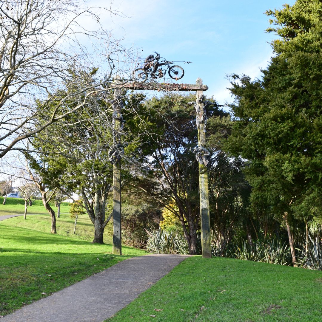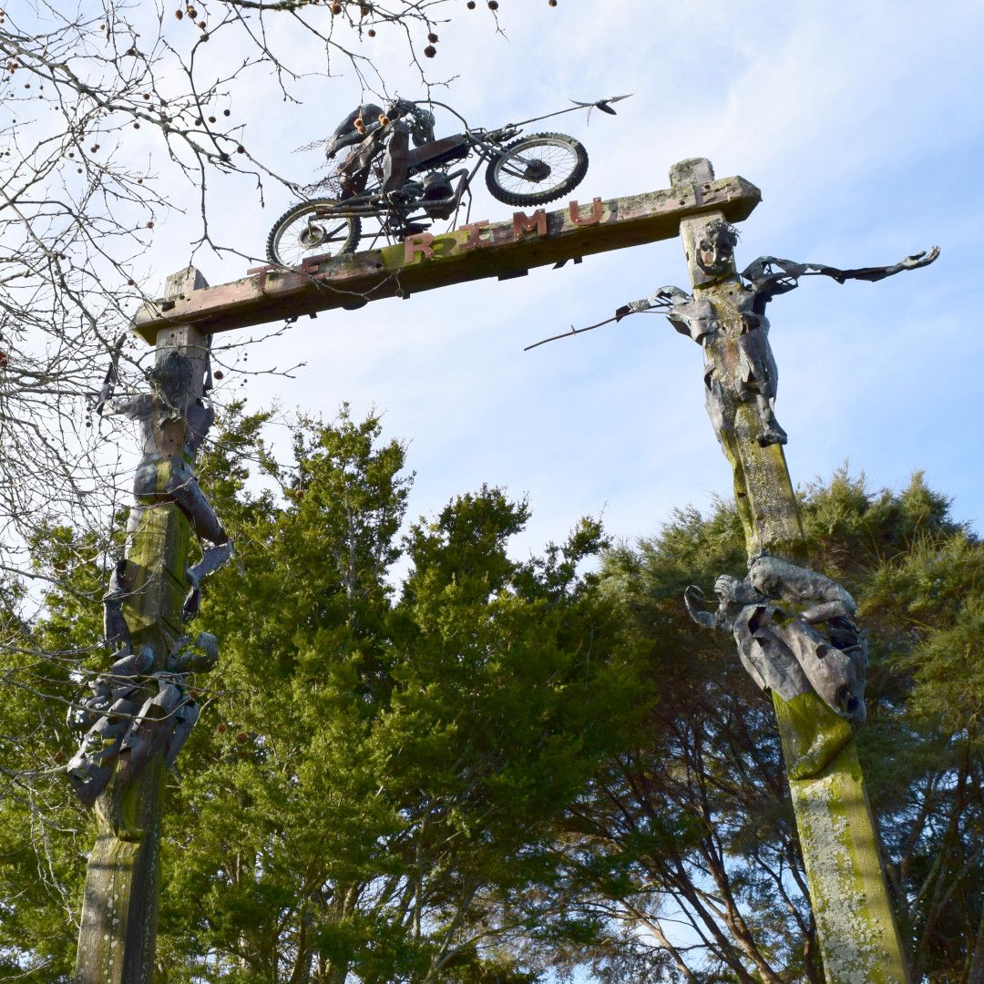 This large archway is made of tōtara, adorned with copper figures and a motorbike.