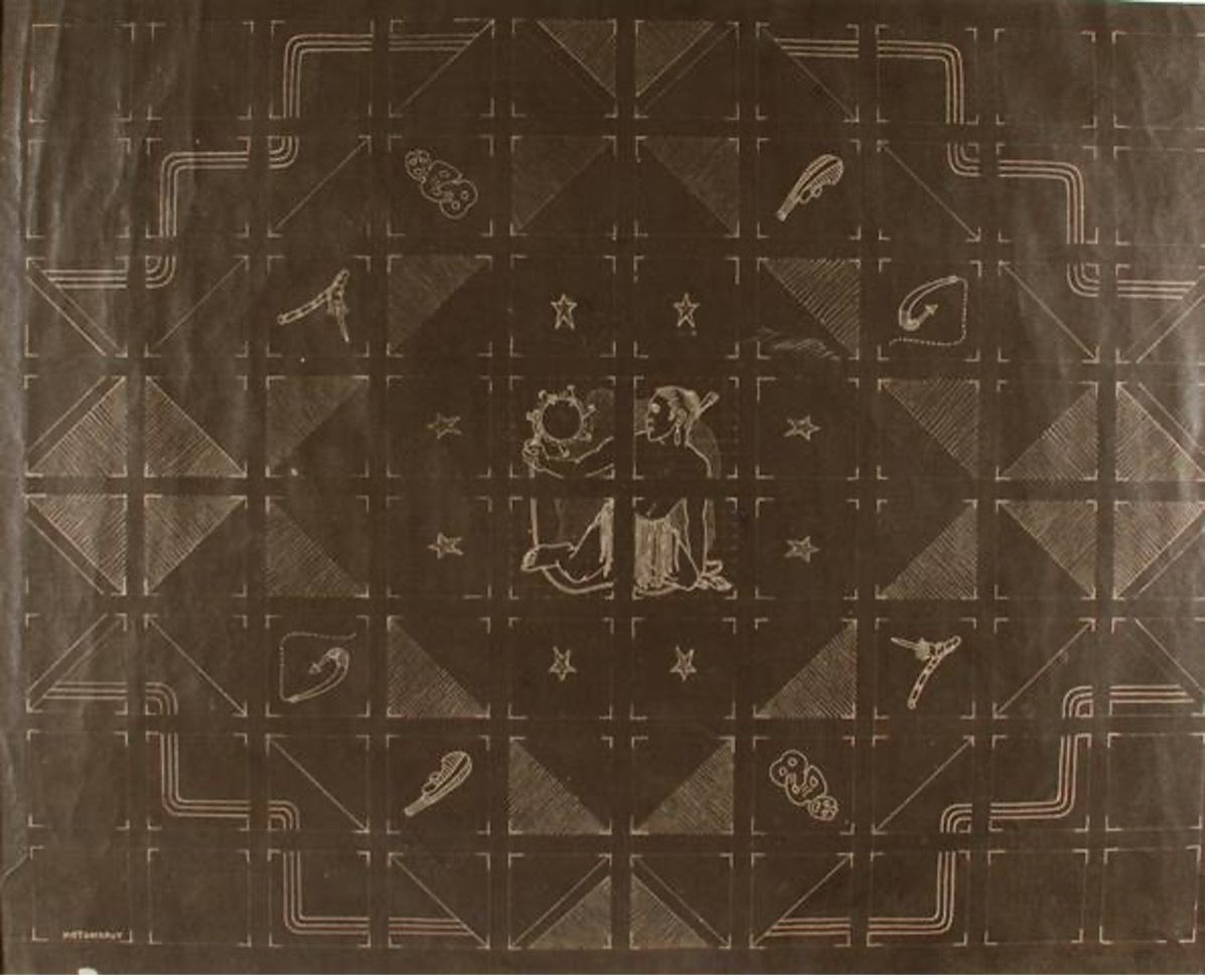 Commissioned by architect R W Syme, James Turkington’s acid-etched and sand-blasted lay-light ceiling mural was once the centrepiece of New Plymouth’s new Post Office Building. An interpretation of the Māori legend of Māui and his brothers harnessing the sun, Turkington’s subject matter was likely to have been inspired by its site at the base of a light well that illuminated the main office and public counters of the building. Turkington travelled to Auckland to supervising the glass sand-blasting. The panes were then shipped to New Plymouth where they were installed under a Perspex covering that gave protection against the weather while still allowing ample light into the ground floor.