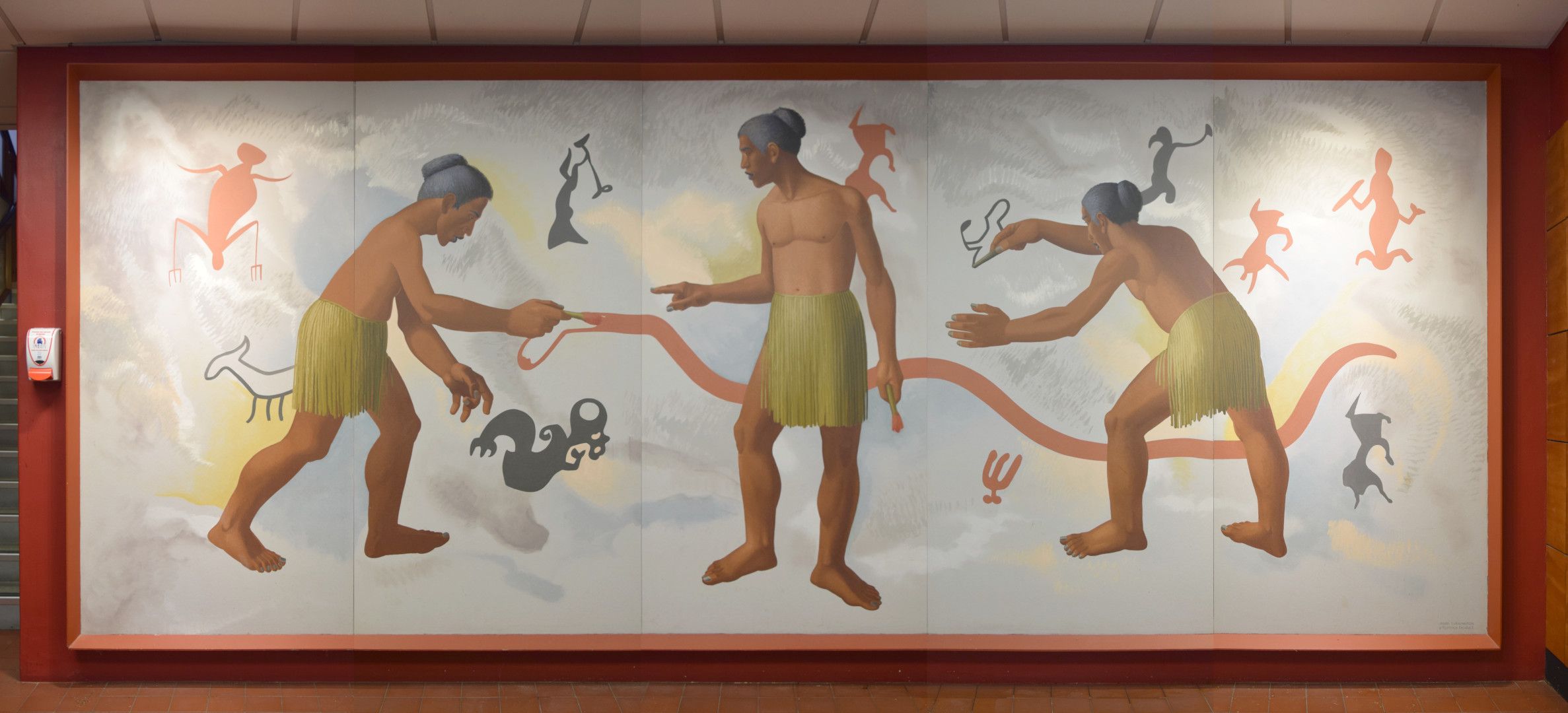 This mural is composed on five panels. Three male figures stand before a textured surface upon which more abstract forms have been painted. These forms are recognisable as historical rock art motifs.