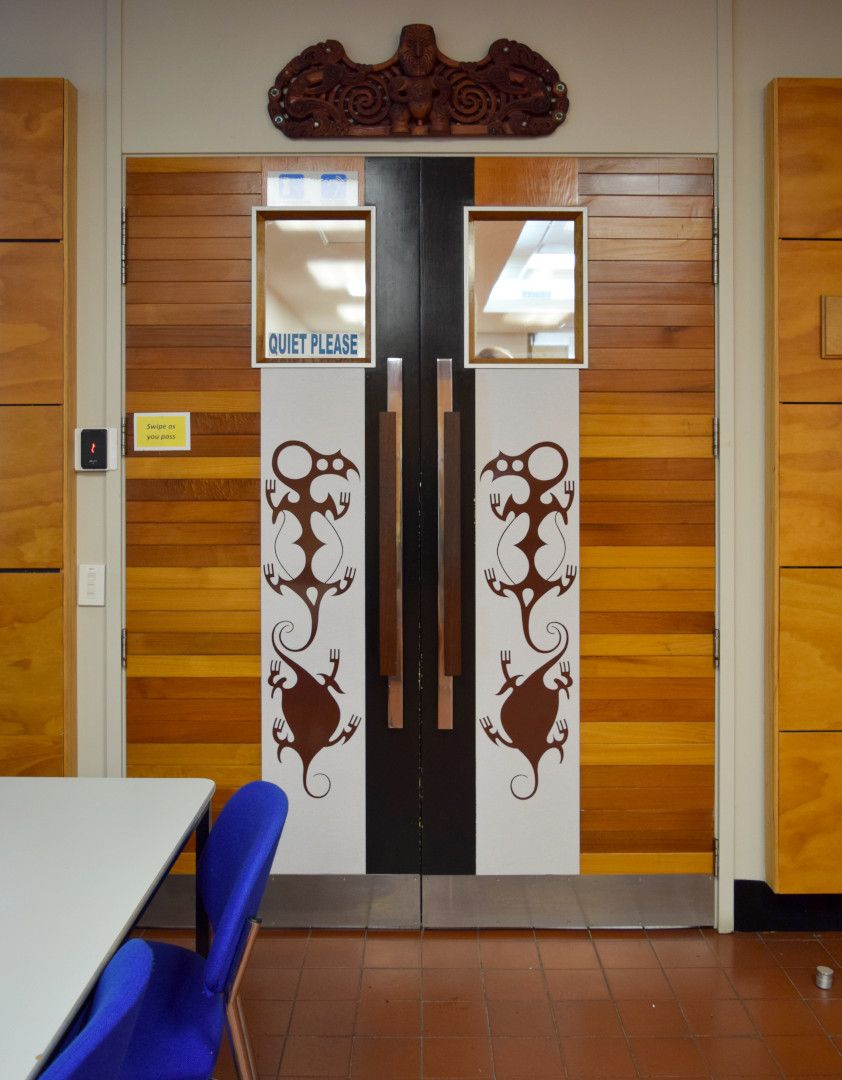 In addition to the large mural in the foyer of Hauora House, James Turkington completed two push-plates for the entry to the Te Kooti Whenua Maori. Each door carries a Formica panel painted with the image of a mythologic creature derived from Opihi River Rock Shelter art. The form is mirrored to create a symmetrical composition as if the creatures look at each other across the doorway.
