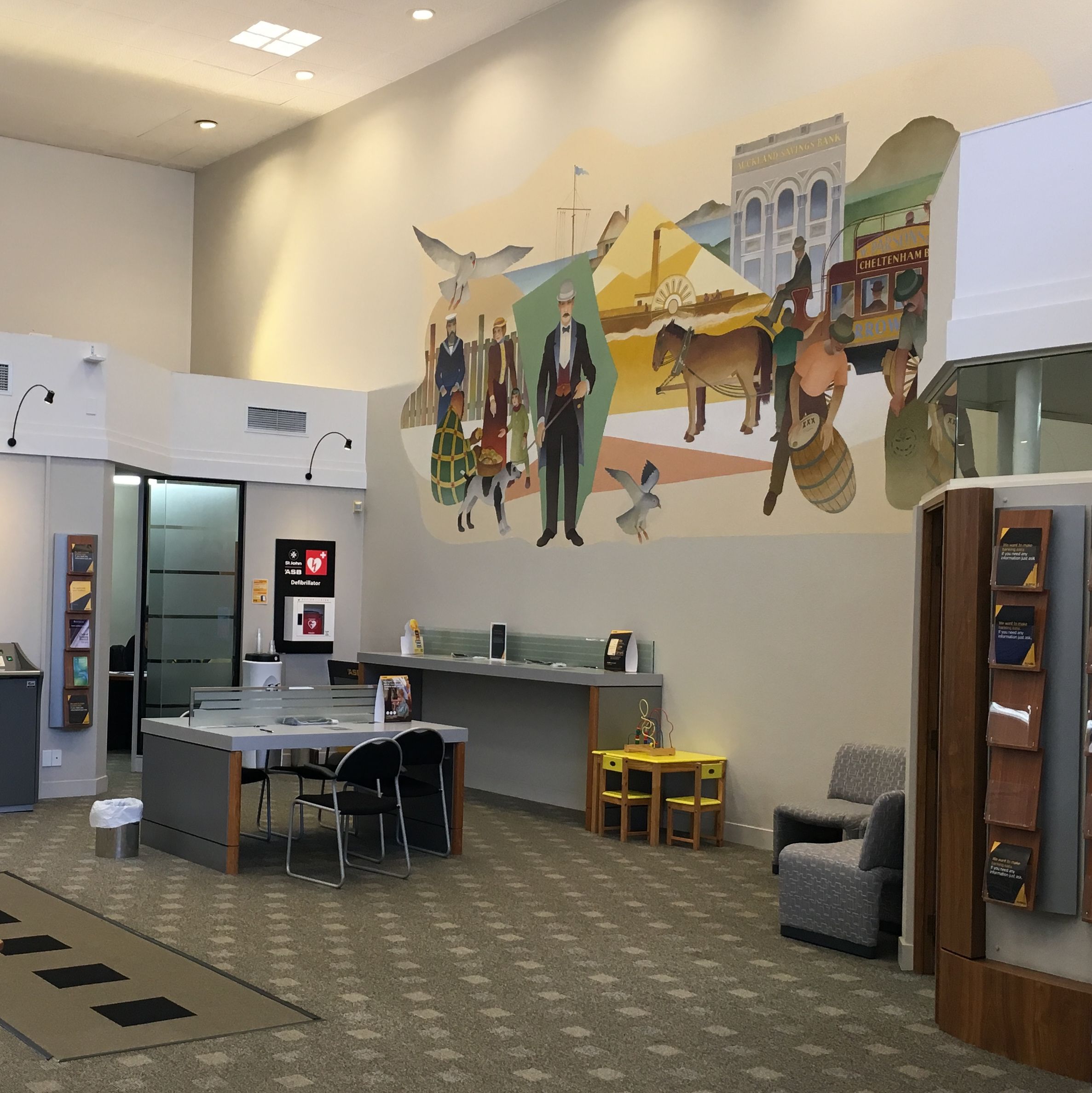 In a slippery inversion of space this mural is a composite image of the street outside the building in the 1900s. Devonport is a Victorian era seaside settlement. The building with three, round arched windows is not any building in particular, but evokes several still visible in the main street. The scene shows men working, a horse drawn transport, and middle class, suited office workers. In the background Mt Victoria (Takarunga) rises up while Rangitoto can be seen in the distance.