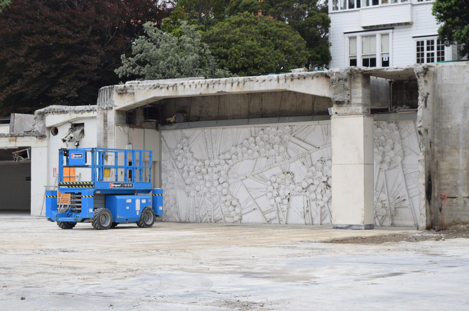 On 14 November 2016 a 7.8 magnitude earthquake, with hundreds of aftershocks, created widespread damage throughout Wellington City. Located on Molesworth Street in central Wellington, ICI House was damaged to the point of being at risk of collapse. Ten days later demolition of the building commenced, however the sculptural relief was saved: protected by a reinforced concrete arch and shipping containers that were placed in front of the mural.