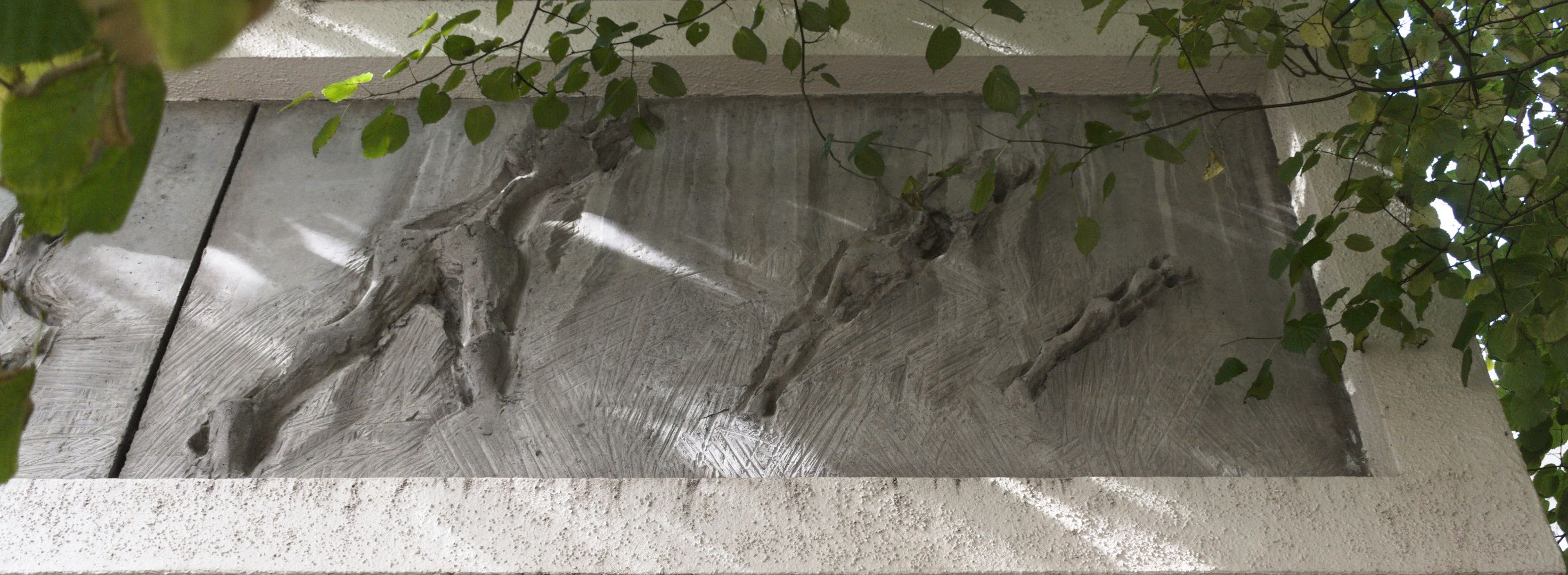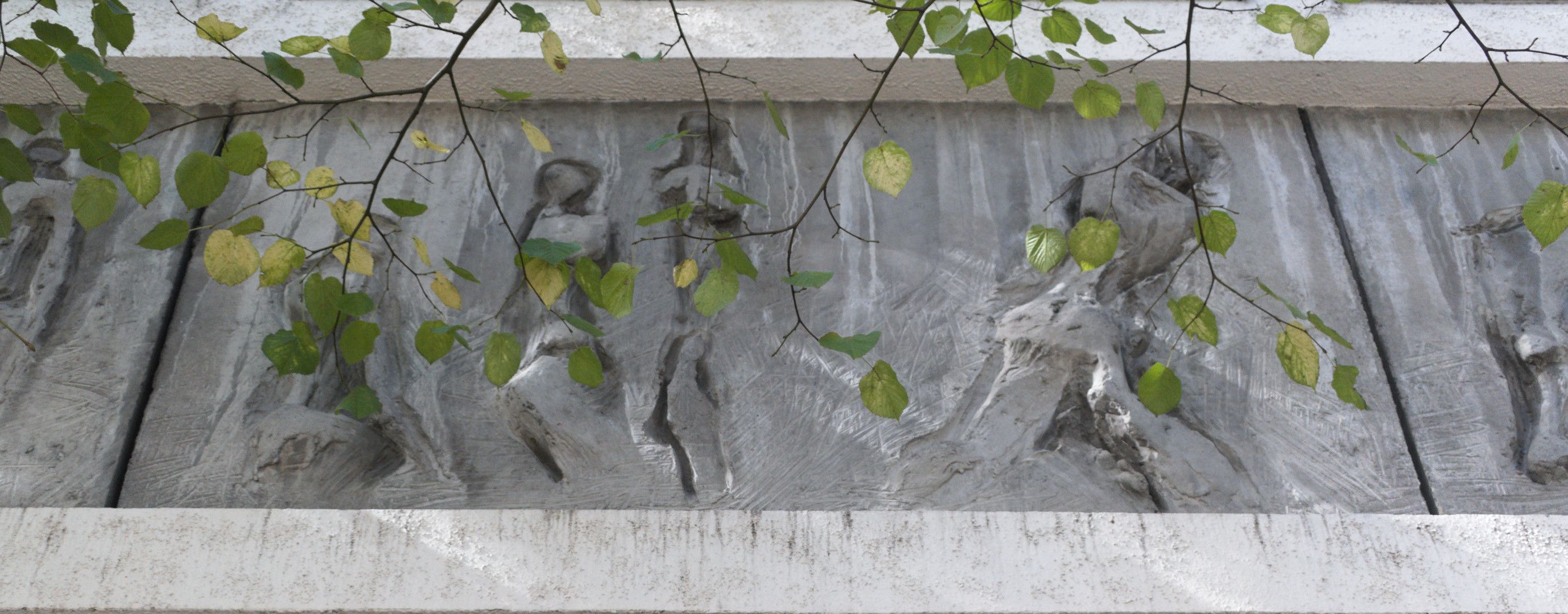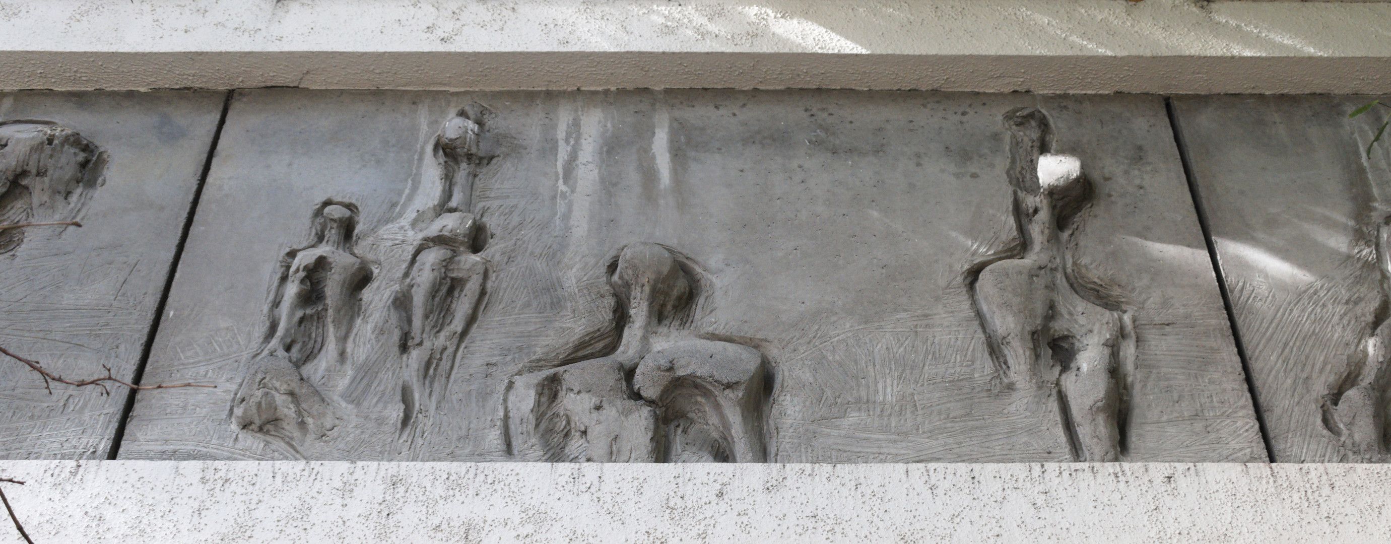 In Jim Allen: the skin of years (2014) Jim recalled the process of making this commission: “I thought a slab of clay of sufficient depth to allow me to dig into and set up on a vertical wall surface would duplicate the conditions under which the finished work would be read by pedestrians.” (p82) His exploration of how light would play across the surface was complicated by technique of “working backwards.” For the final work a plaster cast was taken off the clay turning solid, raised areas into shady hollows in the final work, and vice versa. A ciment fondu, described as a “thick slurry of raw cement,” was applied to the “face of the [plaster] mould, much the same way as applying a gel coat in fibreglassing.” After chipping away the plaster the ciment fondu surface was packed out to sufficient thickness with cement and sand. This left the worked surface including finger prints facing outward; a tradition that can be traced to August Rodin’s theories regarding the importance of the sculpted surface.