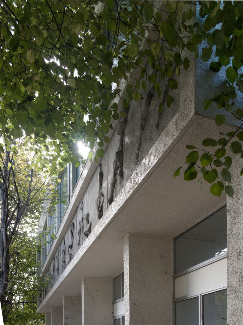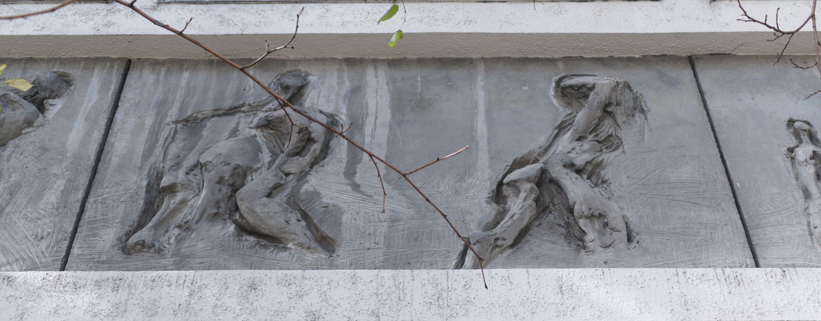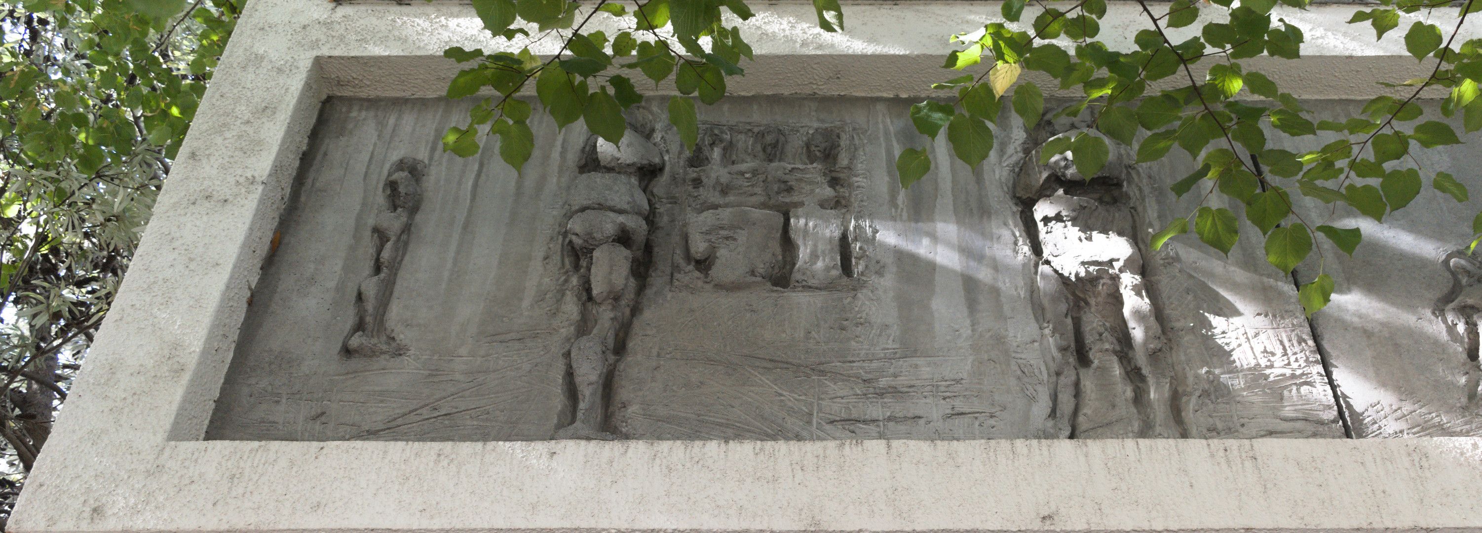 In Jim Allen: the skin of years (2014) Jim recalled the process of making this commission: “I thought a slab of clay of sufficient depth to allow me to dig into and set up on a vertical wall surface would duplicate the conditions under which the finished work would be read by pedestrians.” (p82) His exploration of how light would play across the surface was complicated by technique of “working backwards.” For the final work a plaster cast was taken off the clay turning solid, raised areas into shady hollows in the final work, and vice versa. A ciment fondu, described as a “thick slurry of raw cement,” was applied to the “face of the [plaster] mould, much the same way as applying a gel coat in fibreglassing.” After chipping away the plaster the ciment fondu surface was packed out to sufficient thickness with cement and sand. This left the worked surface including finger prints facing outward; a tradition that can be traced to August Rodin’s theories regarding the importance of the sculpted surface.
