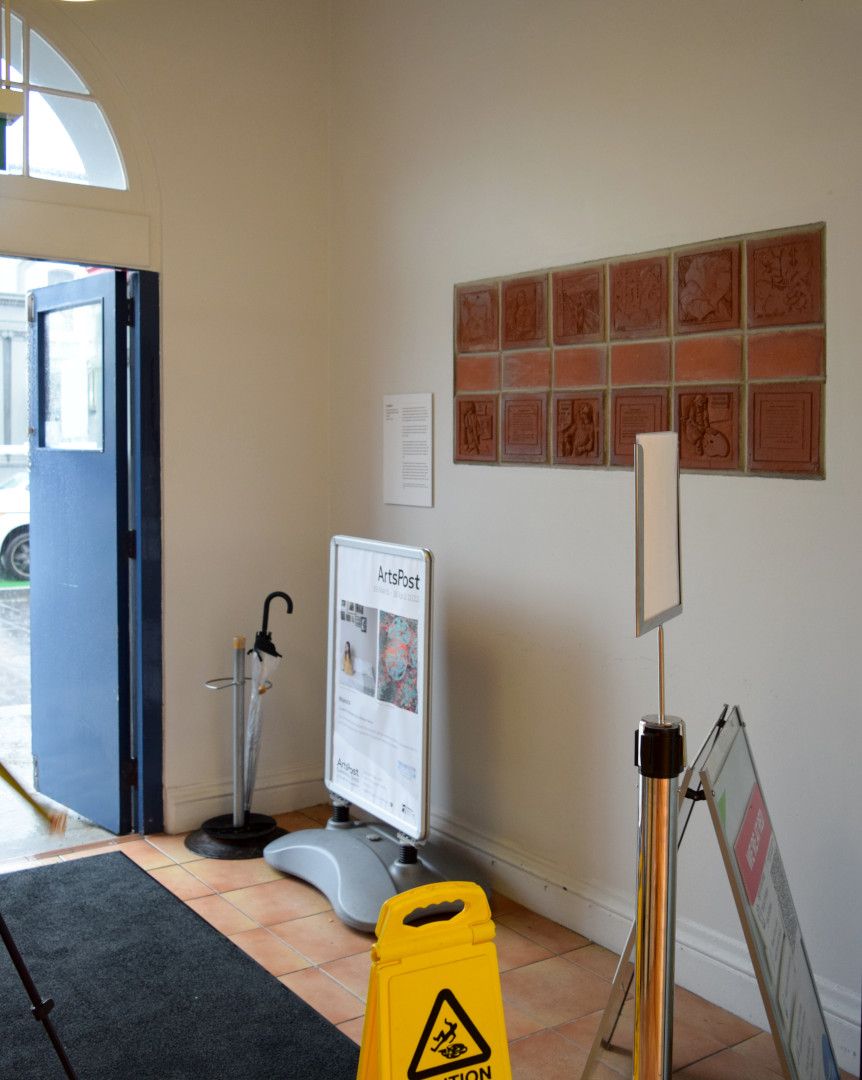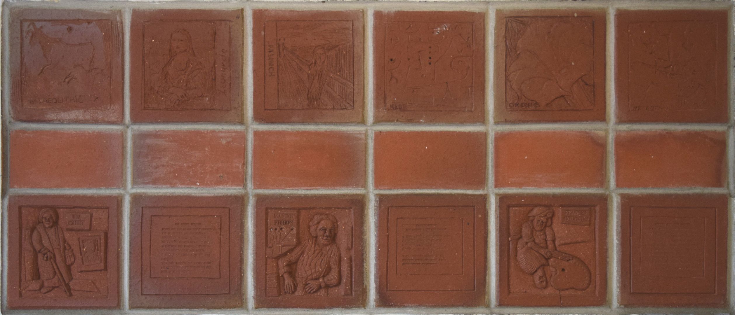 Embedded into the wall of the ArtPost Building is a series of etched and sculpted terracotta tiles. A collaboration between 2 prominent Hamilton artists, it was created for the reopening of the old Post Office. The tiles depict different styles of art (top row of tiles), and 3 significant women artists from New Zealand - Ida Carey, Frances Hodgkins and Margot Philips (lower row).