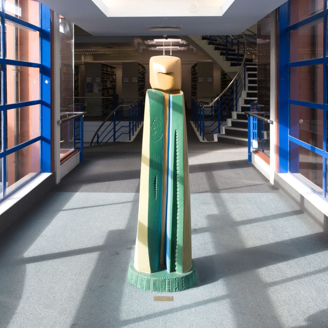 This site specific work was created as the guardian of the library. Carved from tōtara and painted in bold acrylic colours, 'Kaitiaki' is securely grounded to the floor facing the main entrance doors.