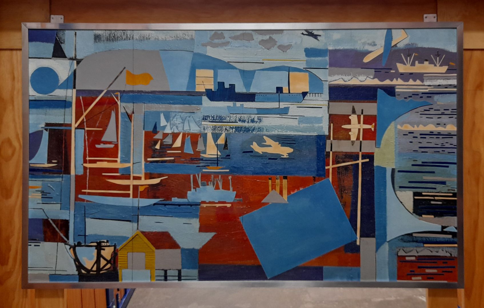 The composition features an underlying collage of shapes in a blue-grey tonal spectrum–possibly inspired by the school’s uniform colours–overlaid with abstracted renderings of a variety of features of Evans Bay and its surrounds including yachts, cargo ships, aeroplanes, rugby goal posts, and other built features relating to the aviation and marine environs.