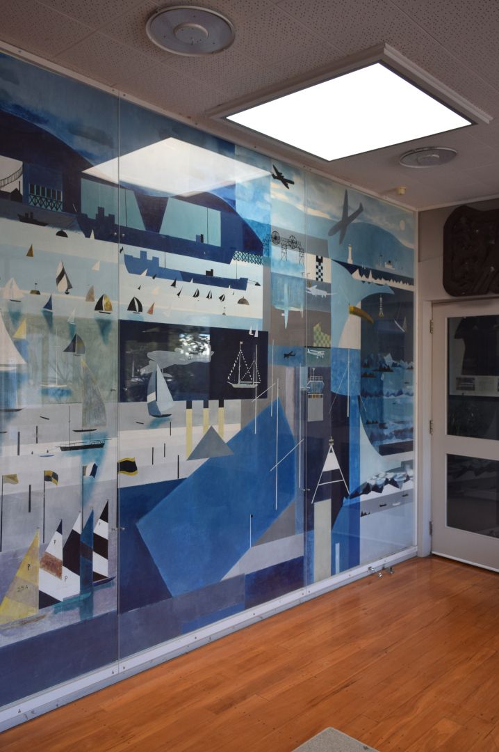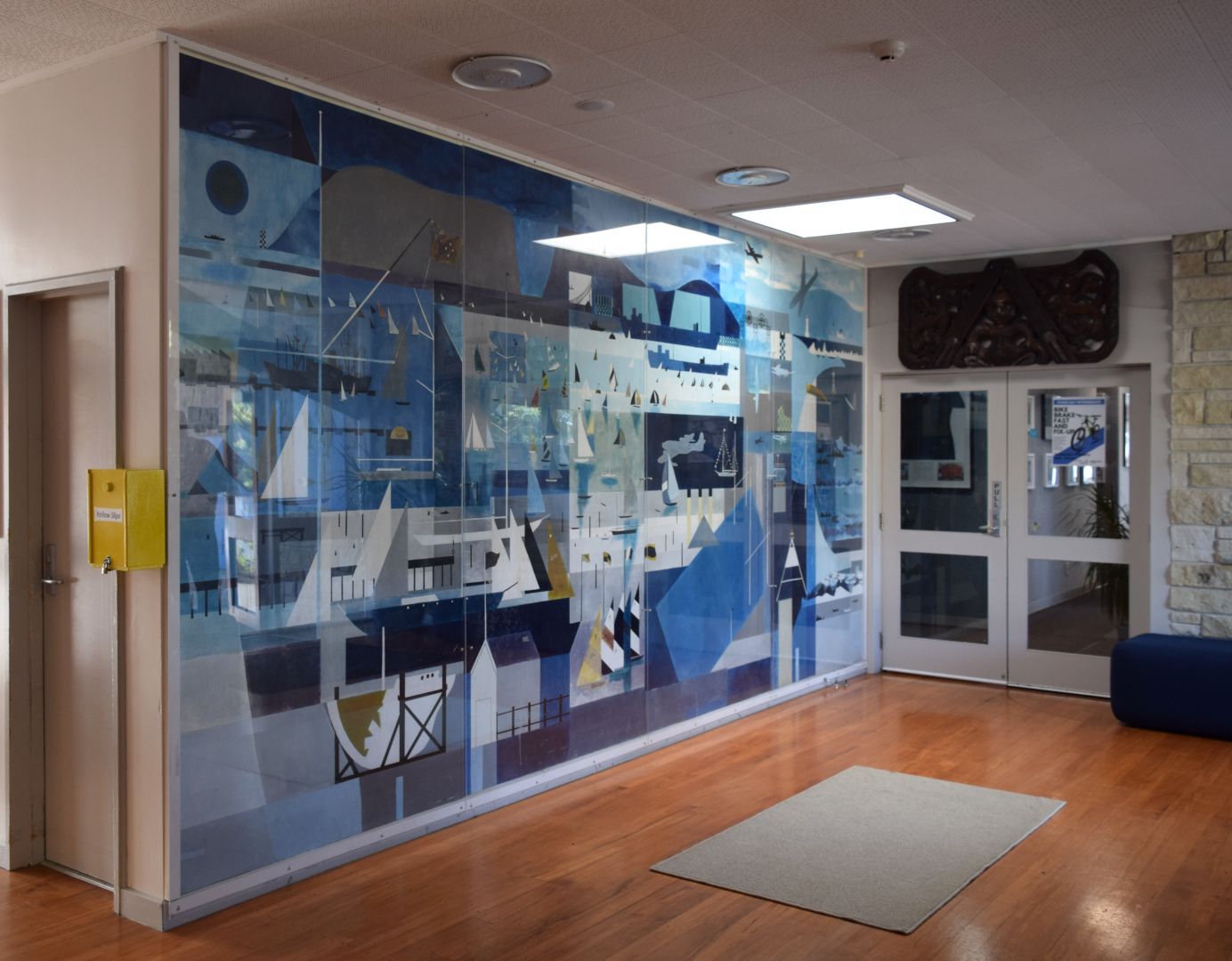 This mural was created for the foyer of the Evans Bay Intermediate School, which opened in 1964. It remains in its original location.