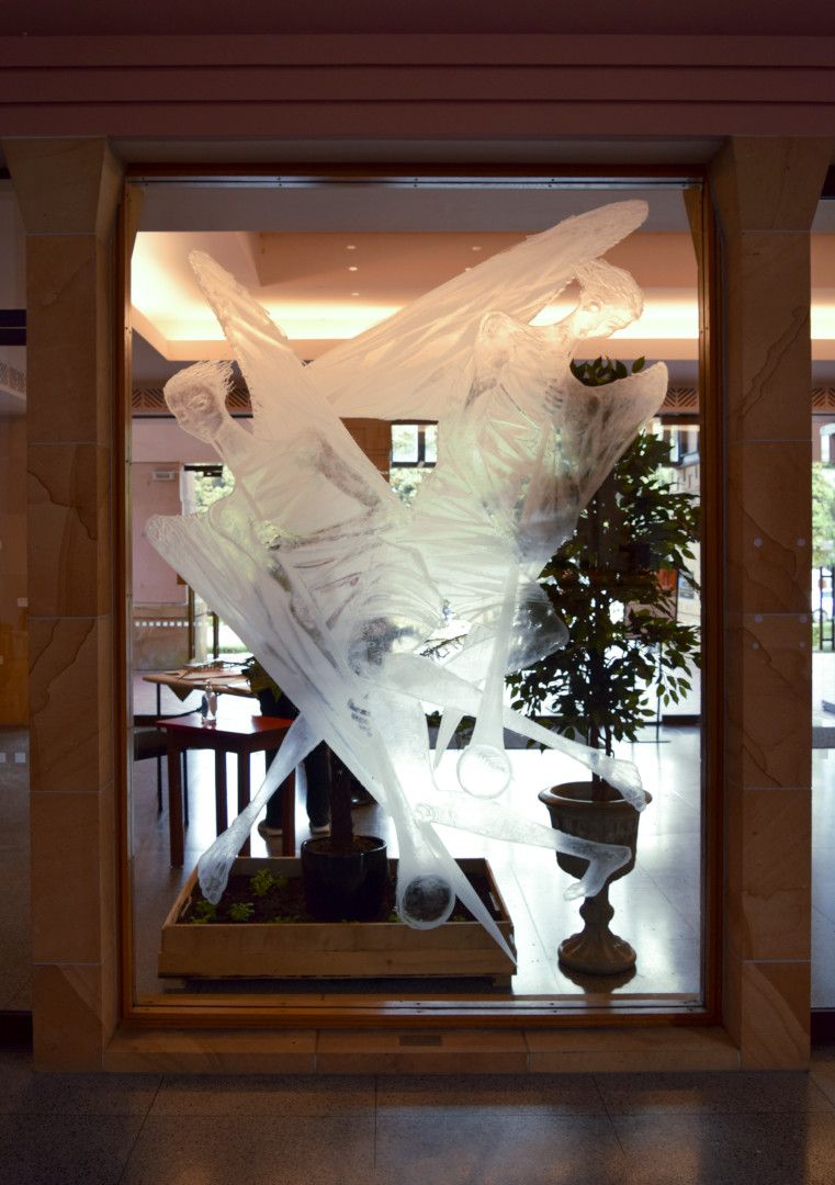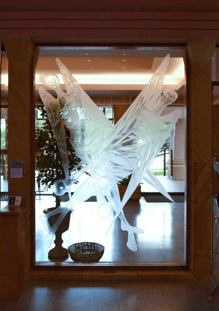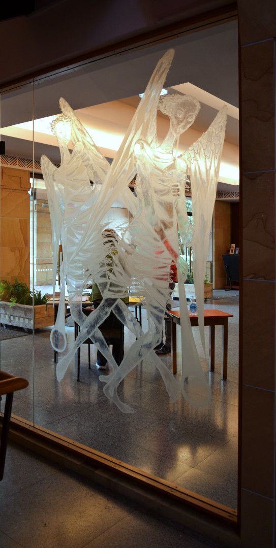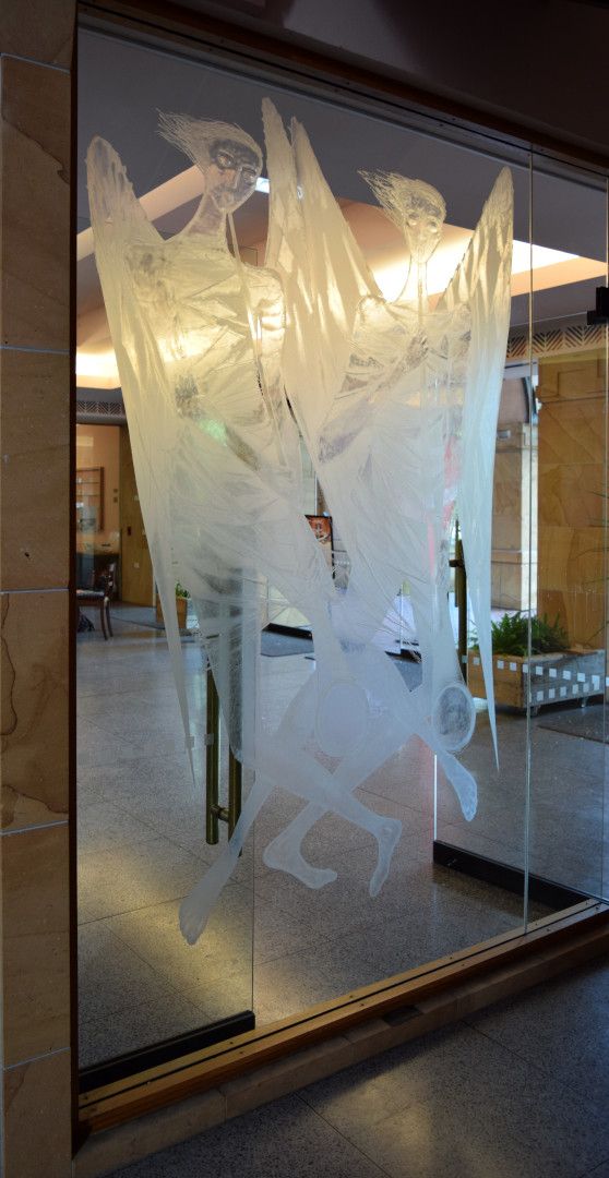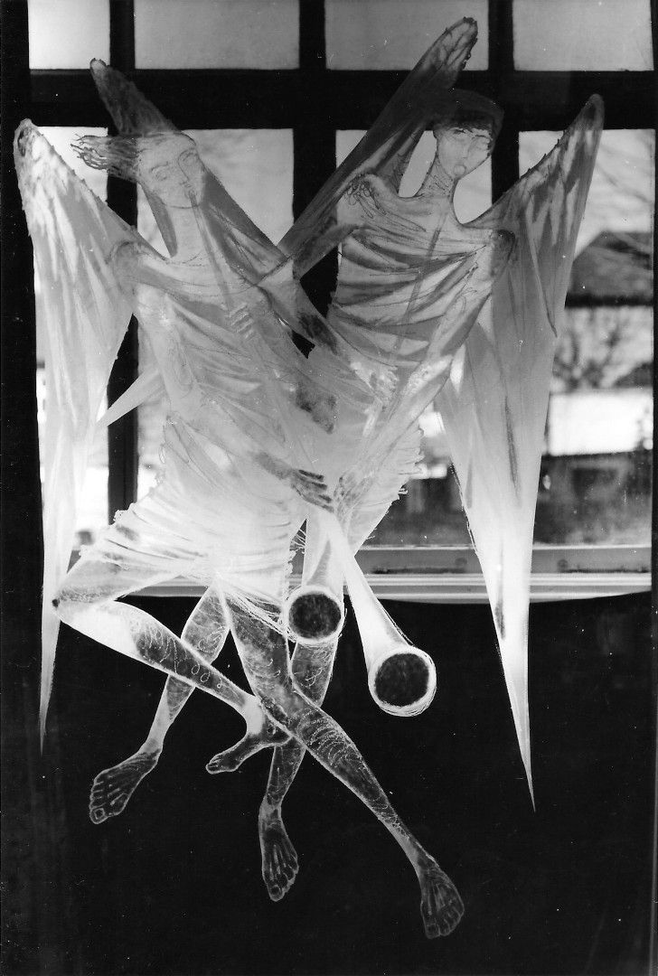 Five engraved windows each depicting a pair of angels. The forms are elongated and angular, resembling counterparts in a installation of a work by Hutton in Coventry Cathedral. Only four windows remain (2022).