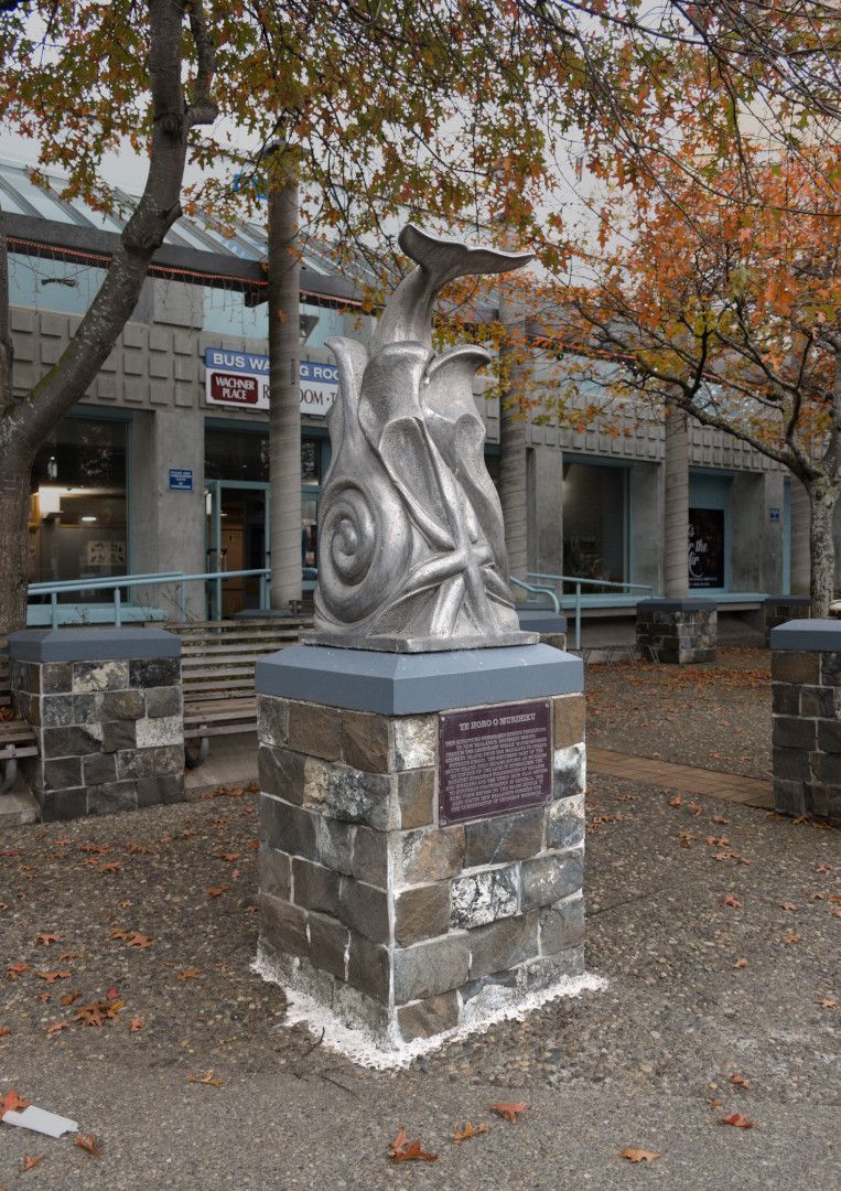 A plaque installed with the work reads: "This sculpture symbolizes events pertaining to New Zealands's Southern Region. There is the legendary whale which severed Stewart Island from the mainland to create Foveaux Strait. The southern part of the South Island then became known as Murihiku or The End of the Land it symbolizes the earliest European colonisation by sealers and whalers and the Union Jack flag refers to European colonisation in general. The koru form refers to the Maori people it also states New Zealand's concern for the conservation of cetacean mammals."