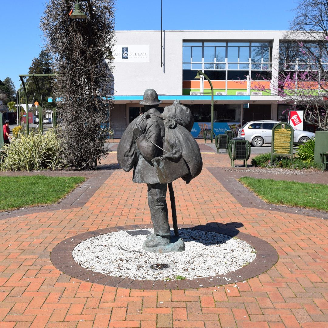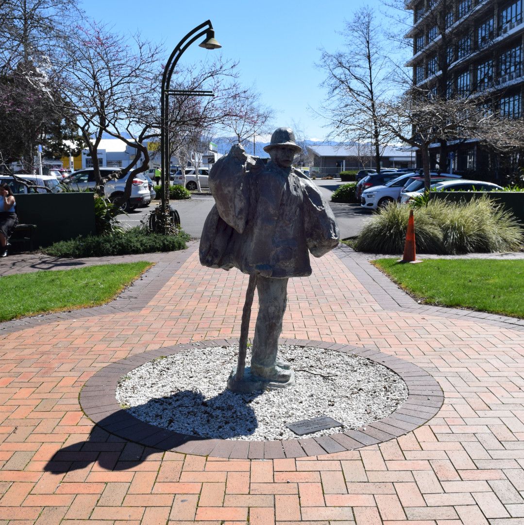Large bronze of Barrett Crumen (1878-1968), a Latvian who arrived in NZ in June 23. The most famous of the 'swaggers' in Wairarapa. In the work he is carrying his swag and walking with his stick.