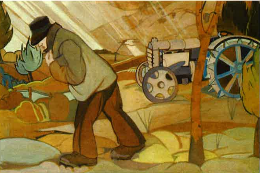 "Above a filing cabinet in the RHS Nursery School office, a large painted panel catches the eye. It shows a farmer walking the land with coat drawn up, hat pulled down and tractor standing close by."