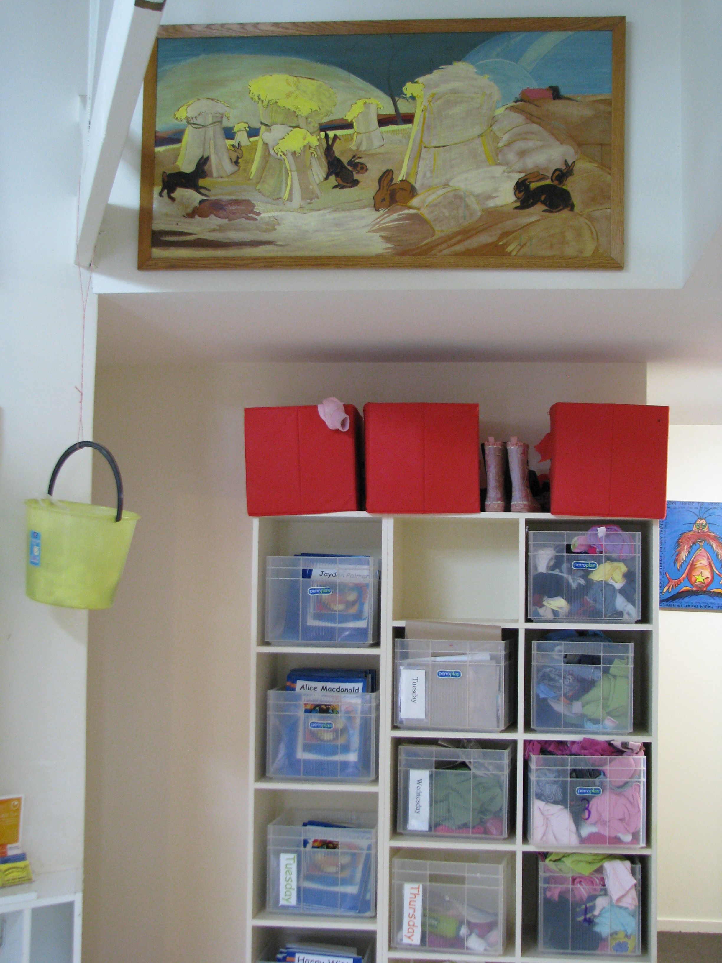 "Elsewhere in the nursery school, hung above rows of lunchboxes and children's play tables, are similar panels showing cows in the field, as well as idyllic scenes of children picking apples, hanging out washing, or swimming and playing at the beach."