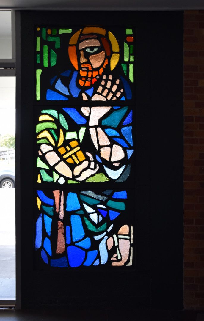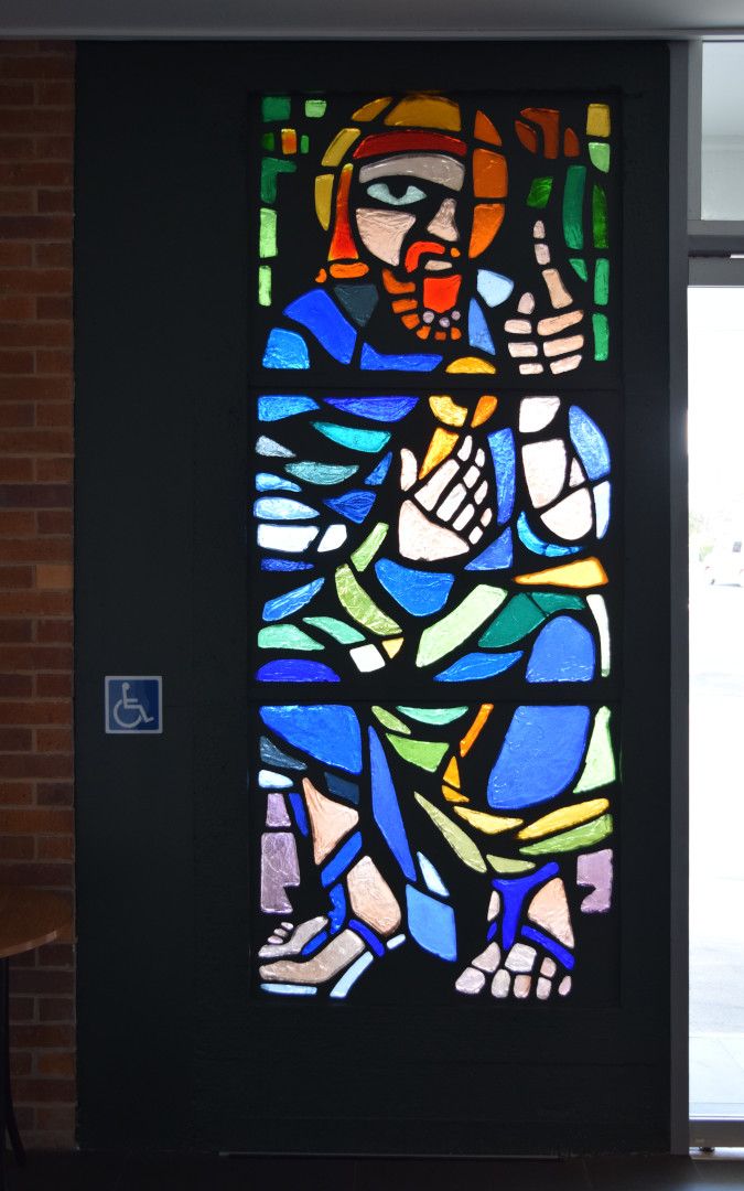 Louise Henderson designed the windows of Saint Peter and Saint Paul for fabrication in slab glass set into cement, a process carried out by specialist Belgian manufacturers. Saint Peter, the fisherman, and St Paul, the writer, stand 3 metres high and, as the artists said at the time: “My saints are not goodie-goodies”.[1]