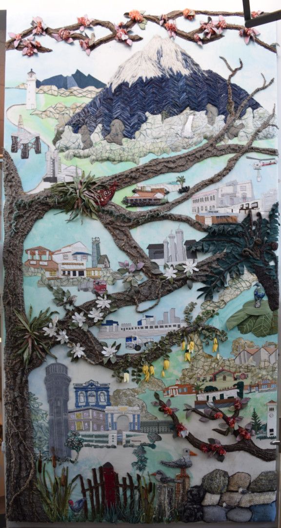 The work depicts all the smaller councils that went into creating the larger South Taranaki District. Work on the piece was was organised by embroiderer, Shirley Julian, who approached Margarett Scott for the design. Scott completed a watercolour cartoon which was cut into small squares for 30 members of the South Taranaki Stitchcraft Guild and the Stratford and Opunake Embroiderers’ Guild to work up.