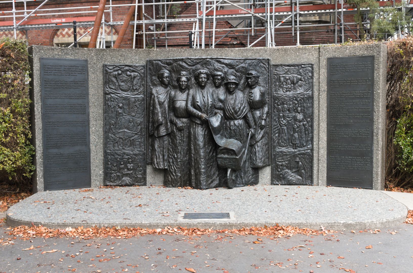 Bronze relief of Kate Sheppard and other suffragettes, flanked by images depicting women working and information panels.