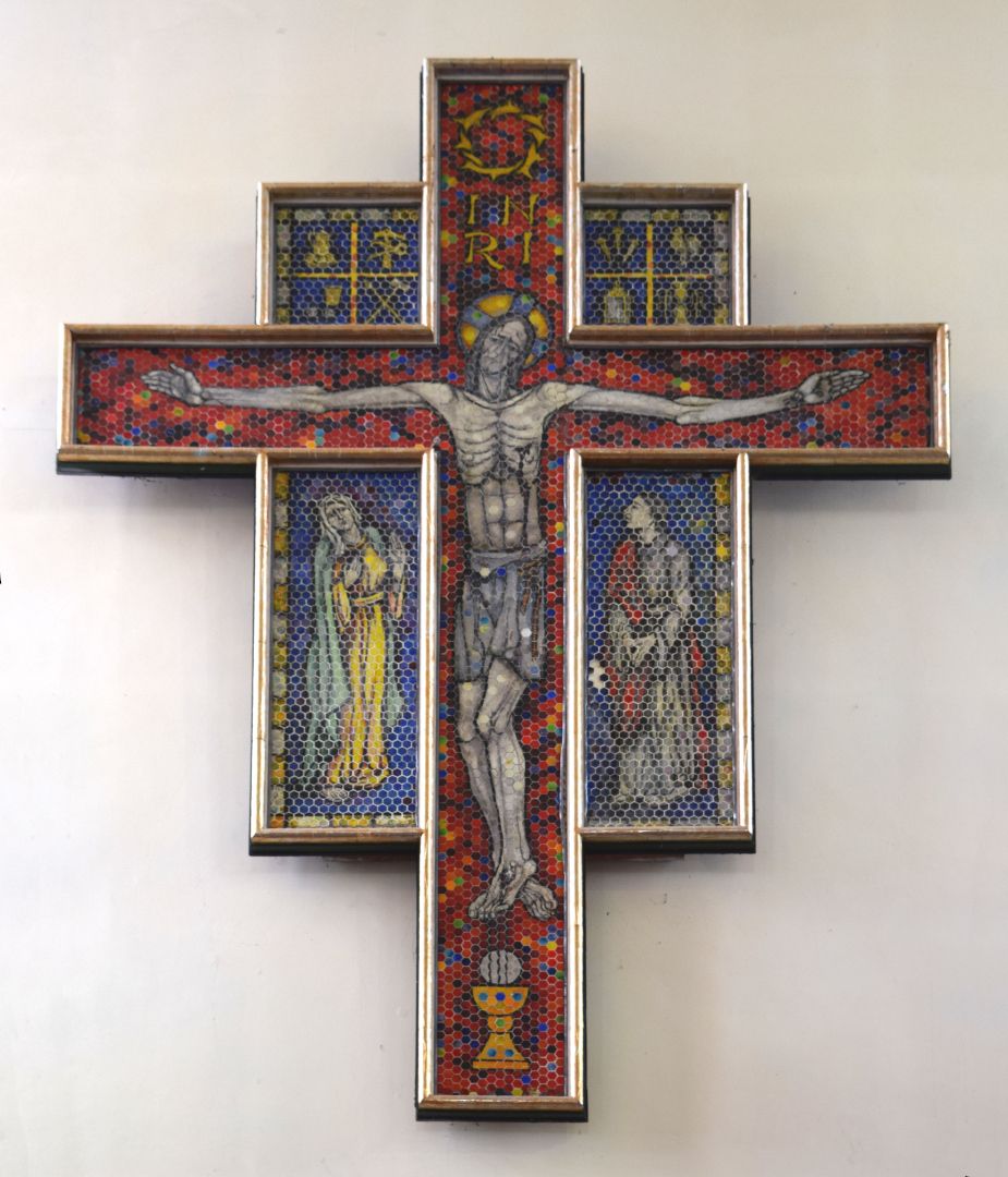 Roestenburg was commissioned to create three works for St Mary’s in Taihape: this work, the figure of the Crucified Christ in the wheel window on the front of the church, and the mosaic of St Joseph in the foyer.