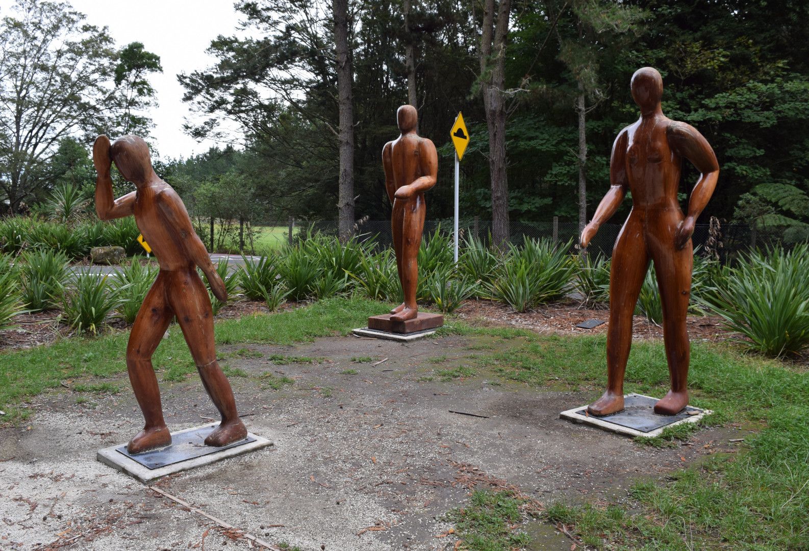 A group of three figures (male, female and child) walking into the forest. These figures were carved from locally sourced Redwood timber.