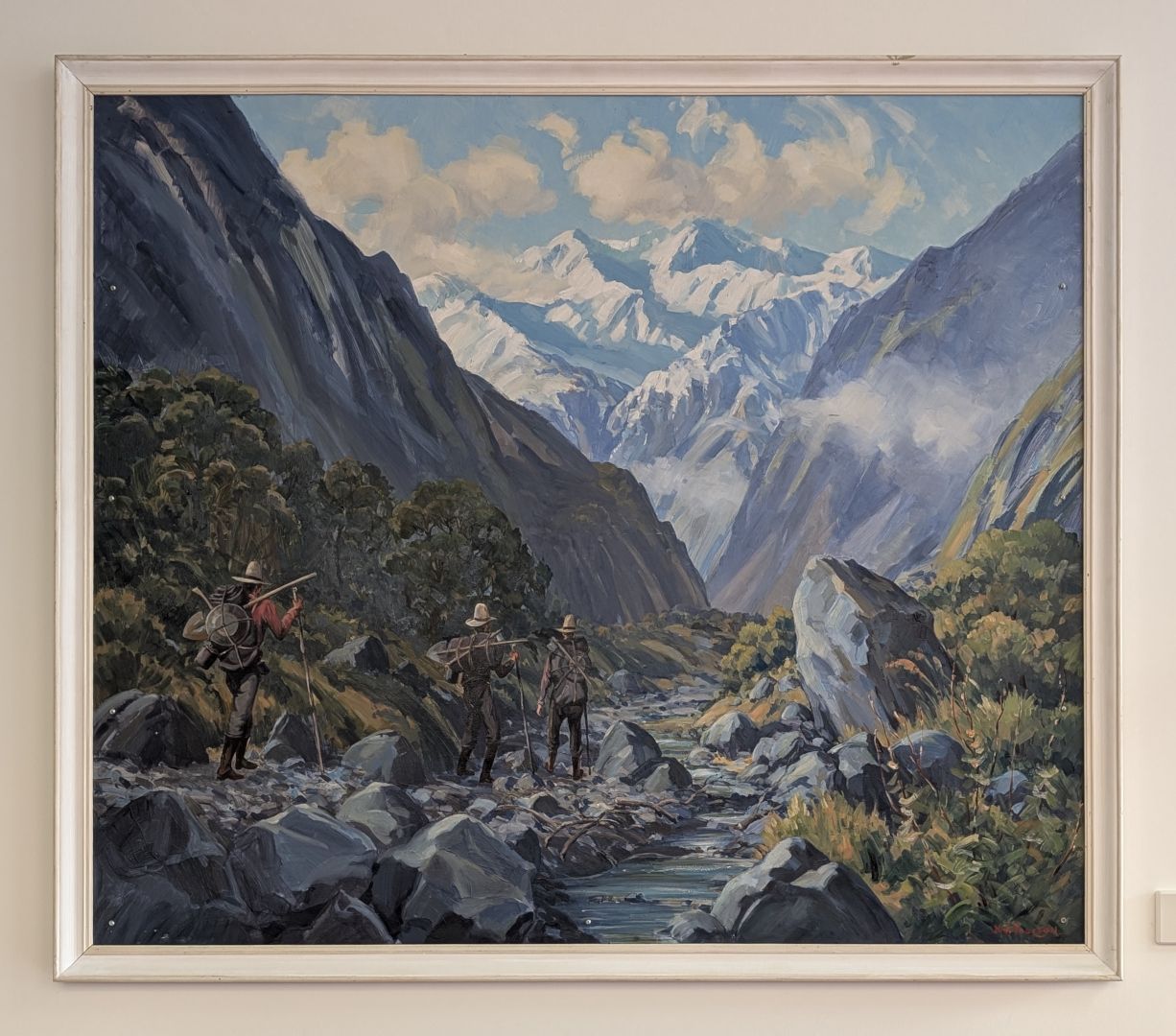 In February 2016 the Governor General was scheduled to visit Arthur’s Pass, providing impetus for Kiwirail to reinstate the artworks to the waiting room. The three paintings were reinstalled, however the mural was not reinstalled until later that year.