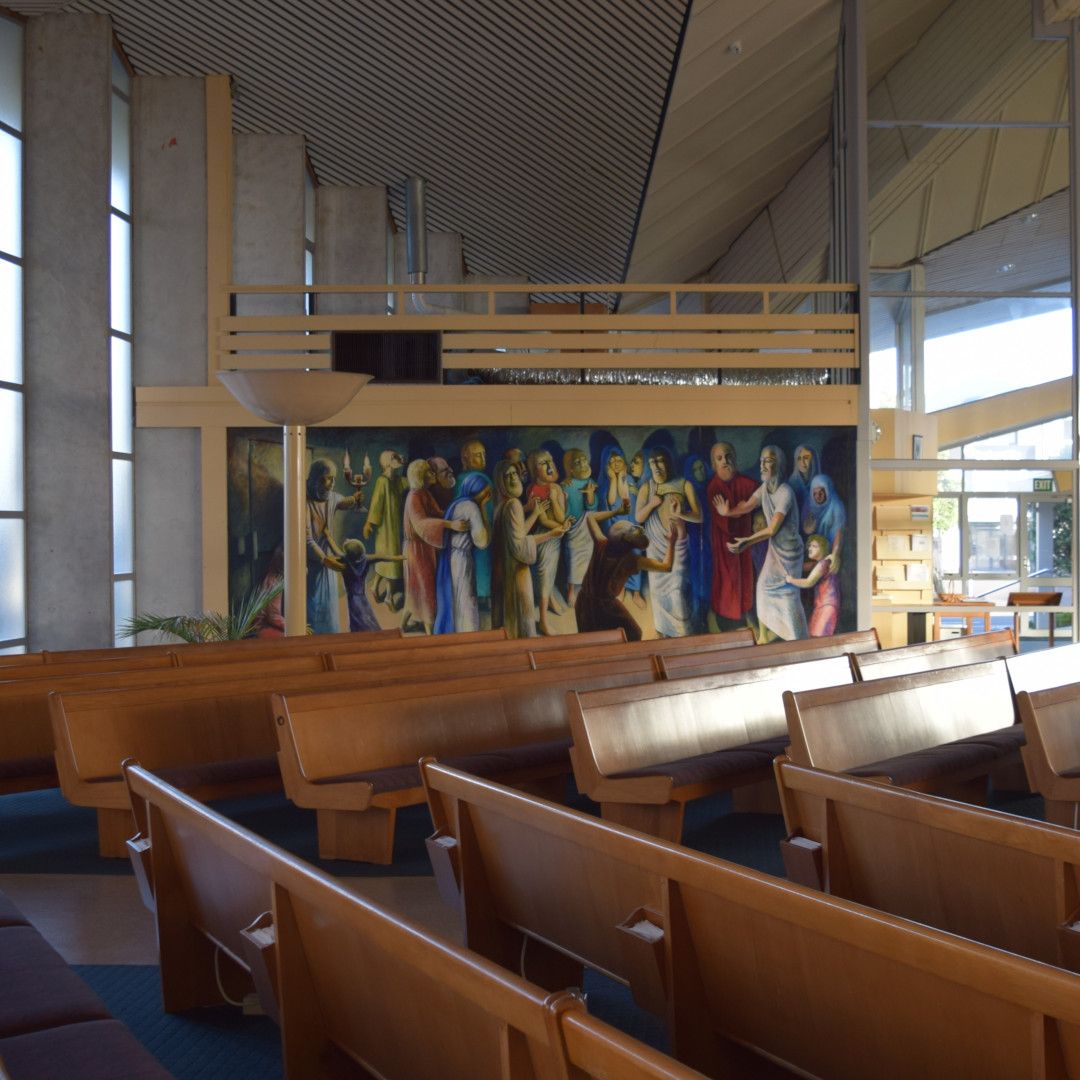 Michael Smither was not actually commissioned to do this mural, but in his view the new, well-lit walls of the recently completed St Joseph’s “cried out for murals." His first charcoal sketch of the work was reportedly cleaned off by a church official in haste. A local priest, however, had seen it and suggested he remake it in a more permanent medium.