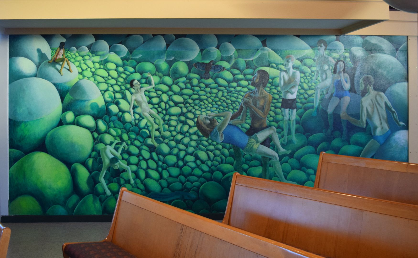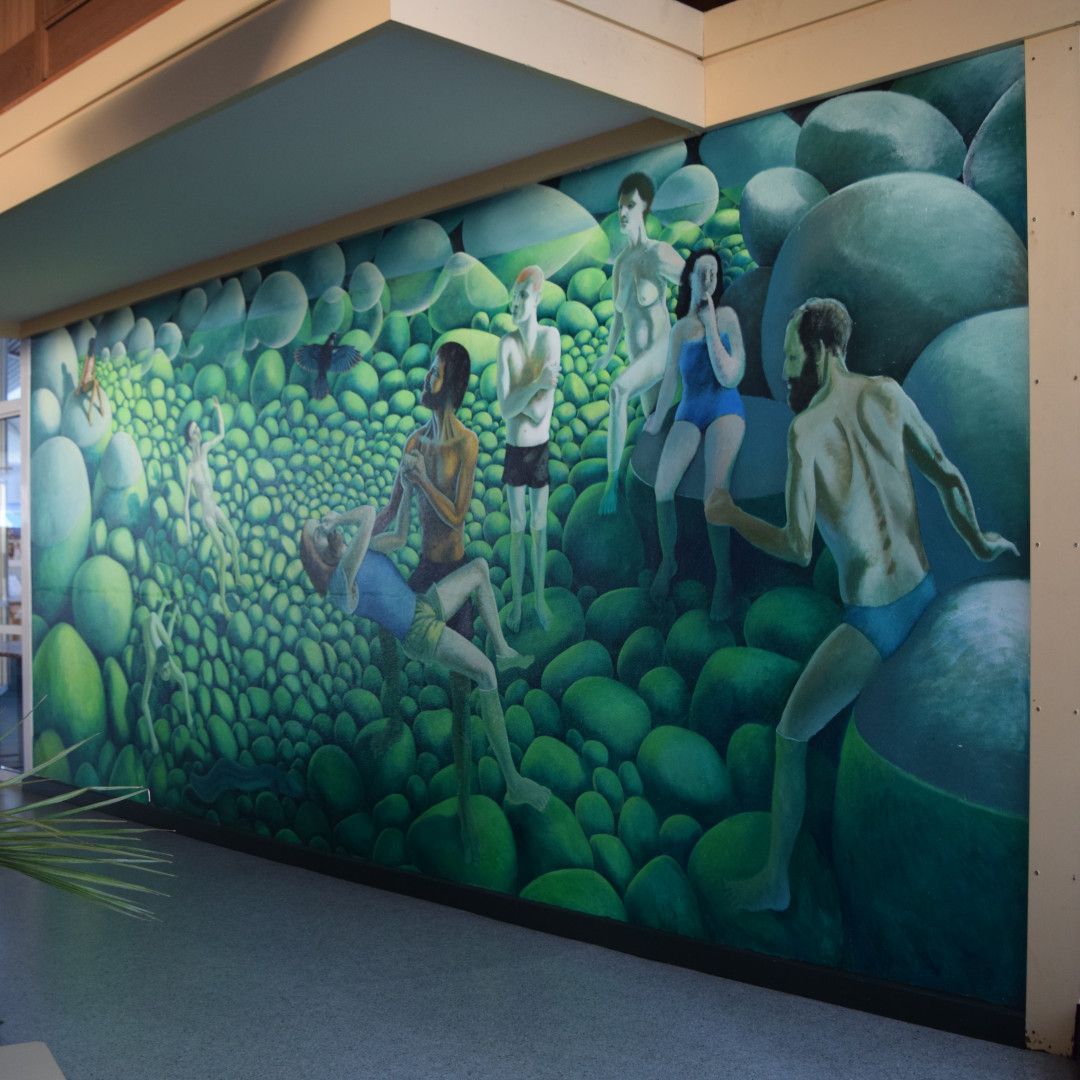 The work is a large wall mural painted in acrylics directly onto the wall.