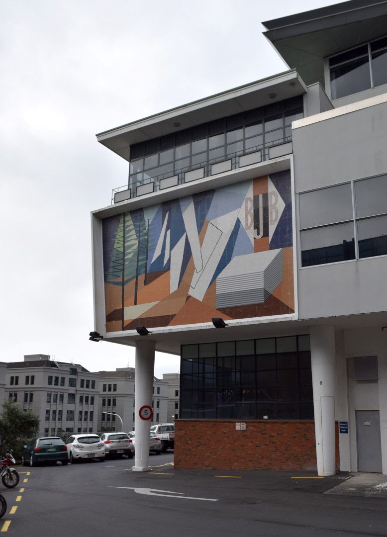 This mosaic is a continuation of Mrkusich’s work for Brenner, appropriately based on Bauhaus principles. The representational aspects of the mural advertise the role of B.J. Ball (NZ) Ltd: a paper-importing company, illustrating the process of producing paper, from the raw resource (trees on the left of the composition) to the stack of paper at the lower right. The mural is like a picture that has been added to the building, rather than an integral part of the structure. Its frame insulates it from the surrounding environment, as if to emphasise that this is ‘art’ and that Mrkusich, post-Brenner, has irrevocably assumed the status of ‘artist’. As Francis Pound has noted, ‘the frame is a familiar sign of “depictivity”, a sign we see not the world, but a depiction of the world’.