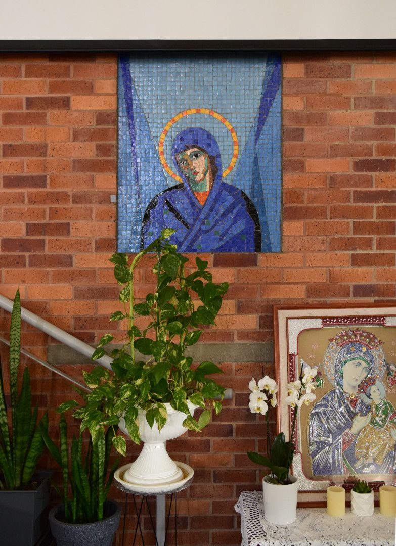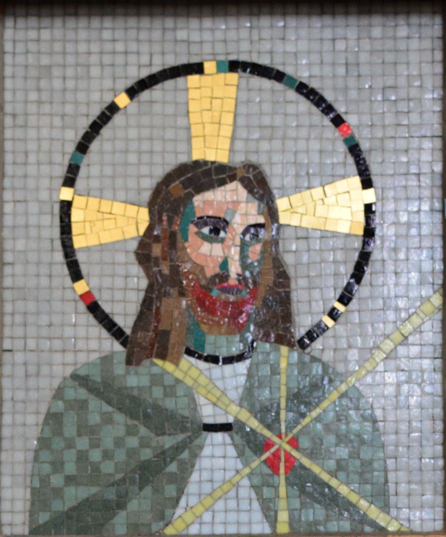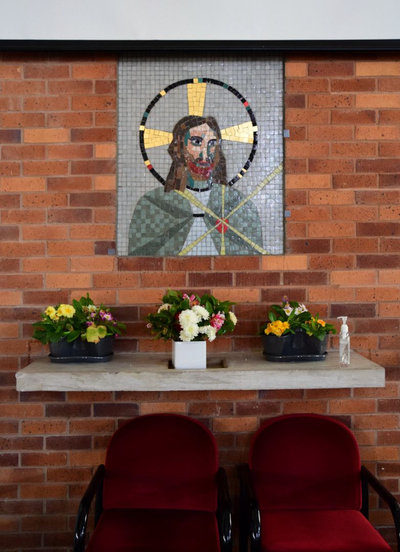 Two mosaics on either side of the altar made using Musital tiles (Italian glass). Christ (head and shoulders with halo) is to the right of the altar and to the left is Virign Mary (head and shoulders with halo).