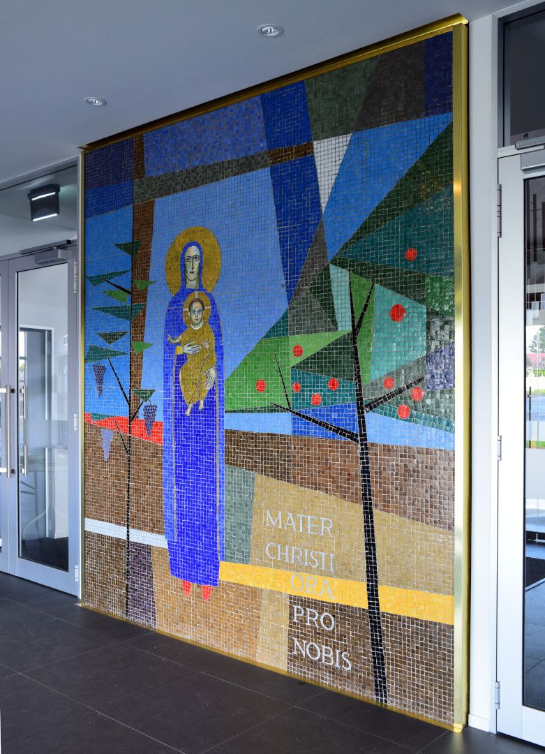 Vibrant blue and gold Musital tiles (Italian glass) have been used to depict Mary and Jesus with a background of geometric shapes and abstracted flora symbolising the district’s horticultural history.