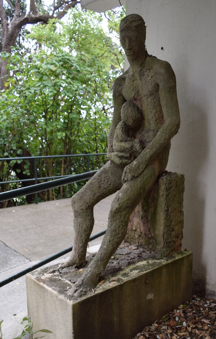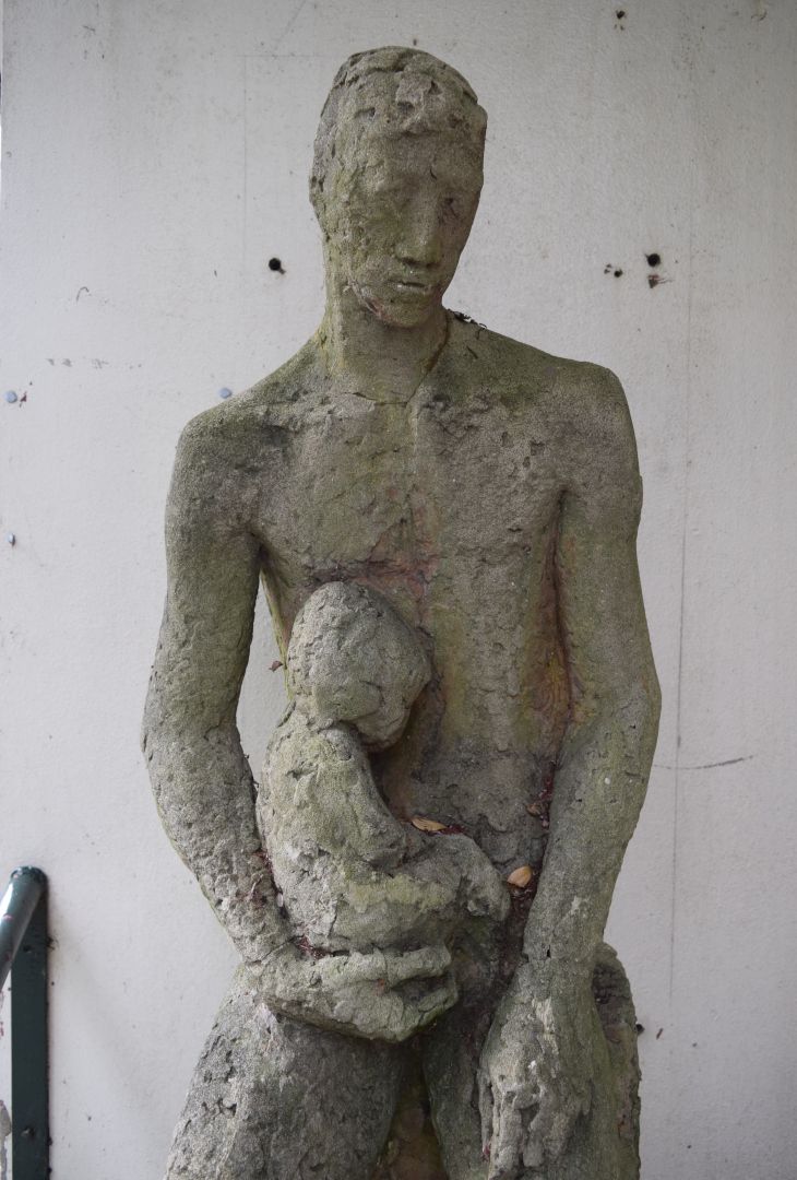A cast concrete figurative work of a nude youth tenderly holding an infant in the curve of his arm. The work is located under a canopy formed by the deck above.