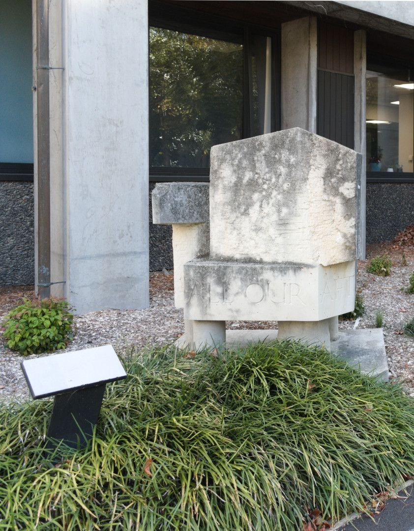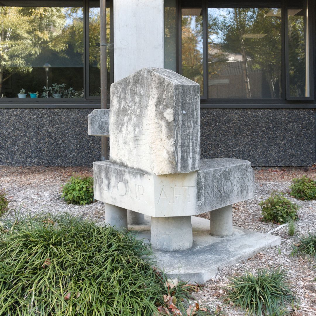 Early in his career, Jones would concentrate on one material, carve several shapes out of it, and then join them together. 'All Our Afternoons' demonstrates this technique very well. As Jones continued developing his methods and style, he began to incorporate several mediums into one piece and focused more on how the piece related to its surrounding environment. Although unintentional, it is observable in 'All Our Afternoons' how Jones’s raw material comments on the robust aesthetic of the surrounding University buildings."