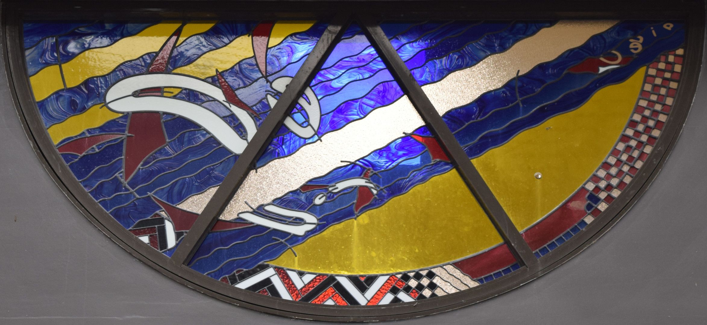 The second window, aptly titled 'Creation of Language,' can be seen above the entrance to the library, embedded within the wall. A semicircle, this work is divided into three sections with distorted vowels floating across all three panels. A poutama (stairway to heaven) pattern, symbolising advancement and growth, sits at the base of the work.