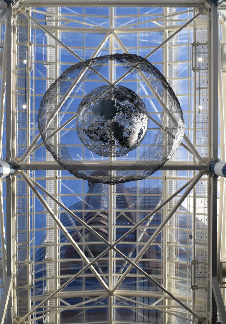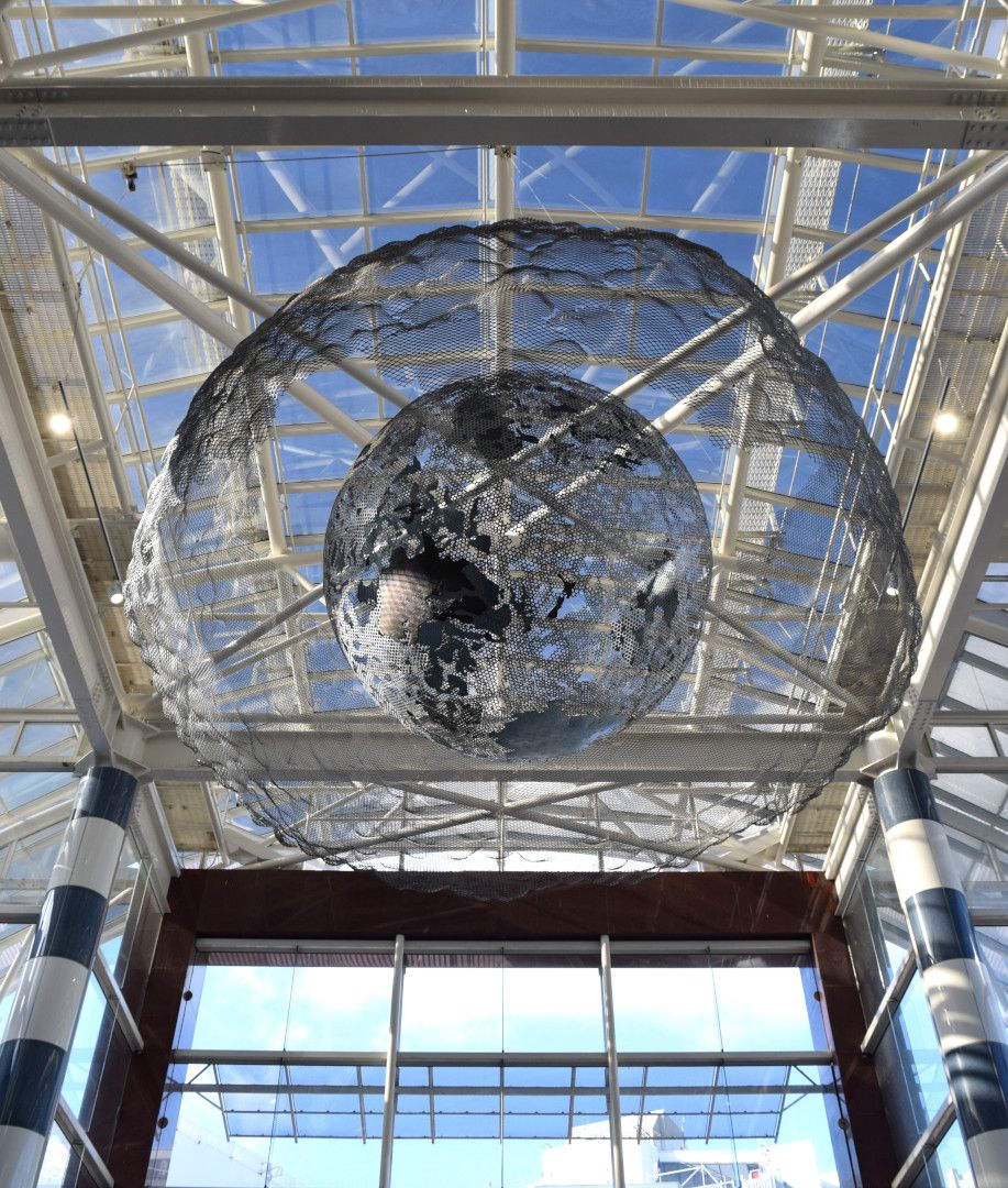 Suspended above the two-storeyed lobby is this floating orb. A delicate silvery envelope encircles a silver sphere: the earth with its cloud cover. NZ is there, but what has happened to Australia? It has giant rents, as if tectonic plates are pulling it apart. Higher up it appears the other continents are in tatters.
