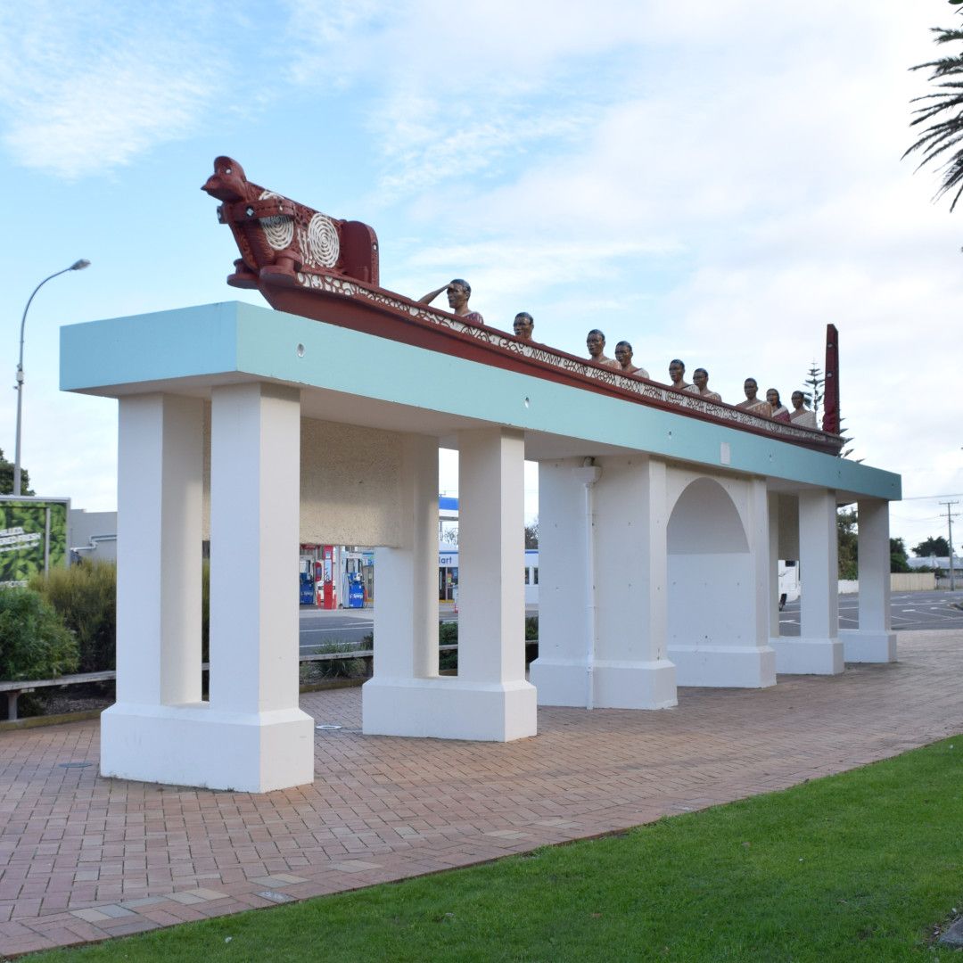 The 'Aotea Waka' celebrates the settling of the Pātea area by Turi and his hapu after they voyaged from Hawaiiki to Aotearoa in the 15th century. They landed at Kawhia and travelled overland to Pātea naming many landmarks on the way including Tapuae, Oakura Waingongoro, Ingahape, Kaupokonui etc. The 'Aotea Waka' was unveiled 2 August 1933 by the Minister of Internal Affairs, J A Young.