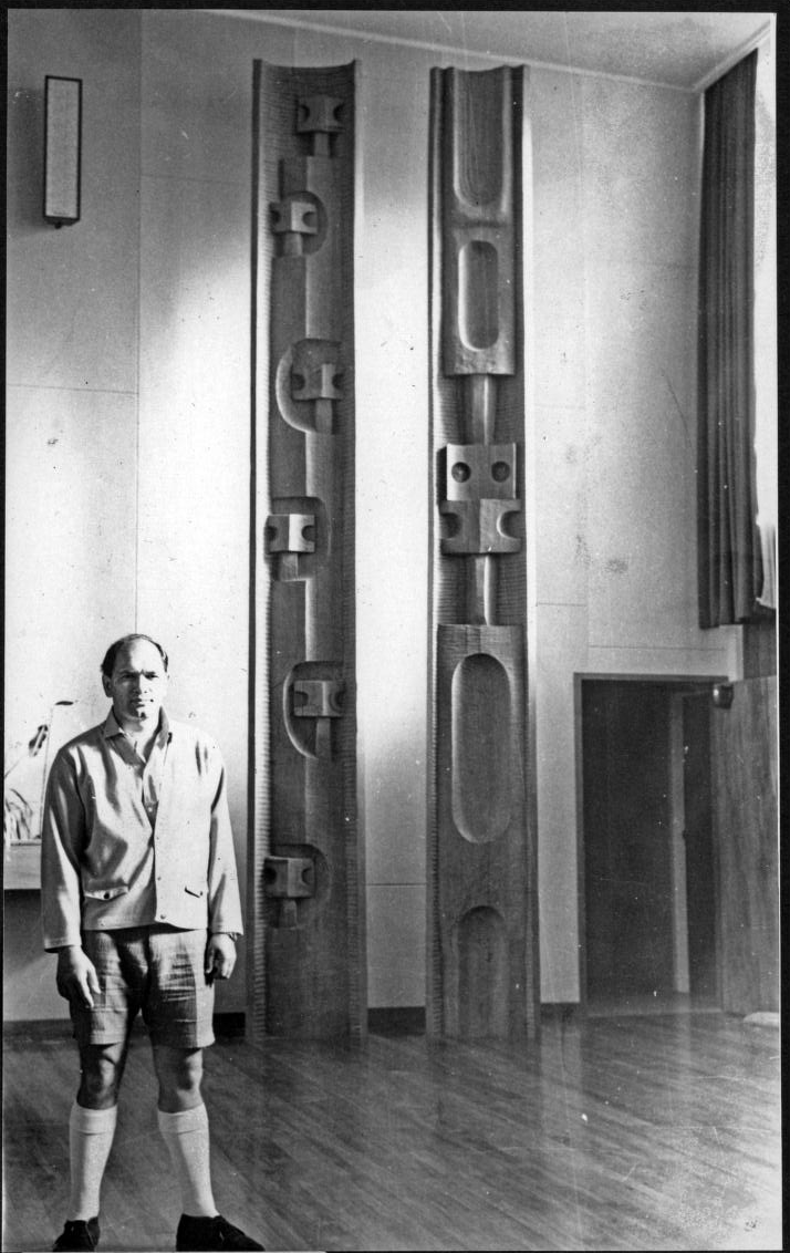 - Para Matchitt with carved pillars depicting Māori creation story at Catholic Girls Secondary School photographed by John Bergeson in 1966. (University of Auckland Collection)
