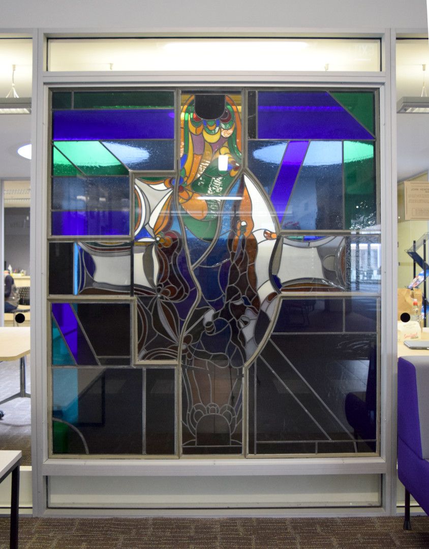 "This stained glass window was installed as a memorial to John Henderson Percy 1930-1983 by his friends across the University and elsewhere, and the School of Engineering. JOHN was a student of the School of Engineering, graduating B.E. ( Hons ) in Civil Engineering in 1953. / JOHN was also a member of the staff of the School from 1954 to 1961, and from 1967 to 1983, Professor of Mechanical Engineering from 1970, and head of Mechanical Engineering from 1980. / The Design, inspired by a photo-elastic image of a strength of materials test specimen, was transposed by Pat Hanly. The glasswork was executed by Benjamin Hanly, and Suzanne Johnson."