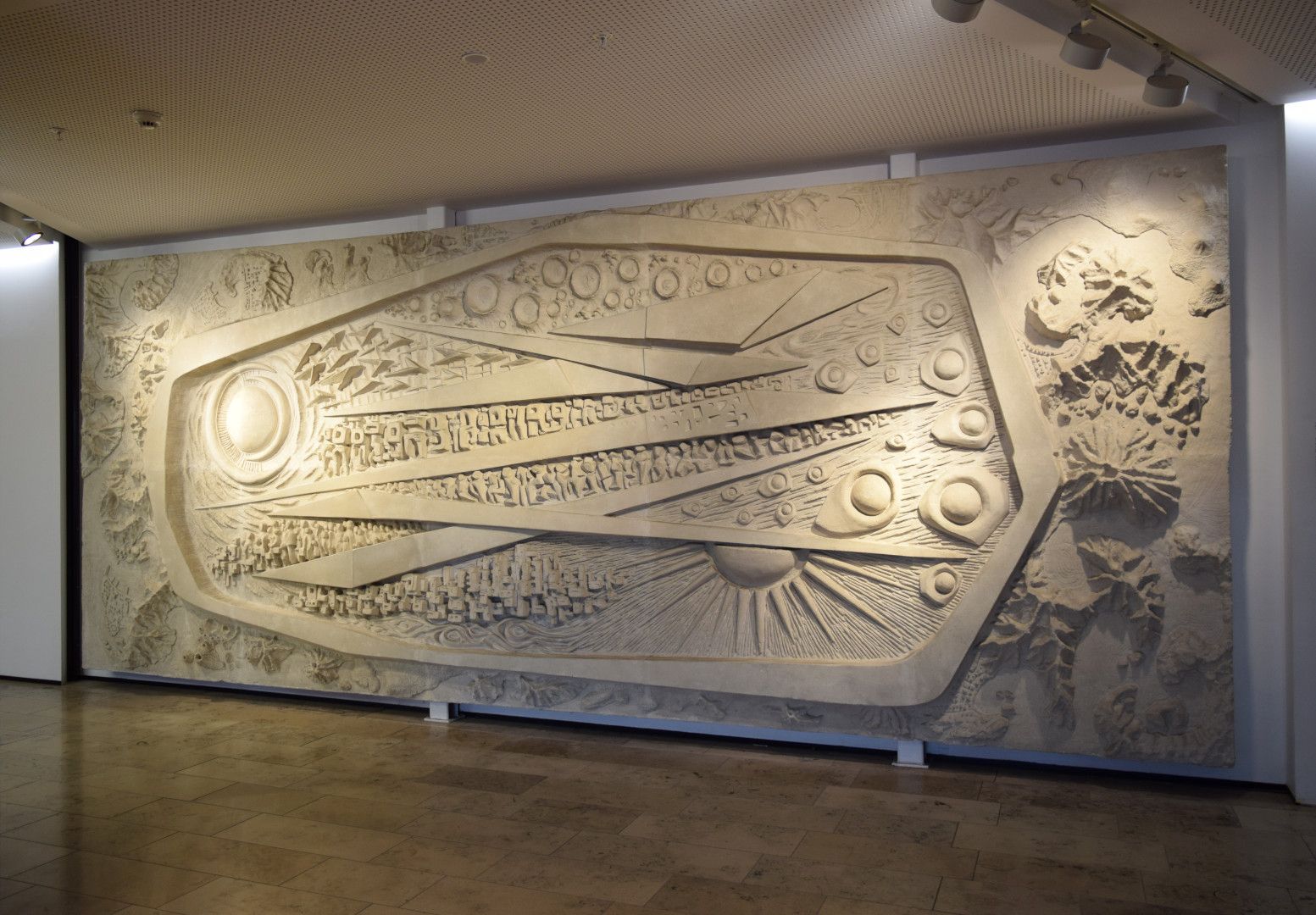 The plaque installed with the work describes its 10 panels as "a dynamic representation of travel in the present and future. This artwork depicts towns and cities as seen from the air, flight paths between cities and over oceans, queues of passengers, and space travel to the sun, moon, planets, and beyond."