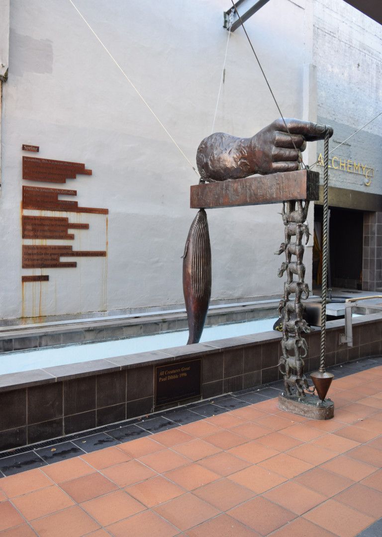 Commissioned by the Palmerston North City Council, the concept of 'All Creatures Great' was drawn from a children’s book which demonstrated the size of a whale as equal to the height of 10 elephants. On one side, the whale rises on its tail from an atrium pond, while on the other side the elephants are stacked on top of each other. These two endangered species together support a lintel, on which rests an oversized arm holding a plumb-bob. Paul Dibble has been quoted suggesting that the work is a commentary on the power mankind has over nature: the future of the world’s largest land and sea mammals lies in human hands. In this way, the work combines notions of protection, preciousness and the precarious balance of nature.