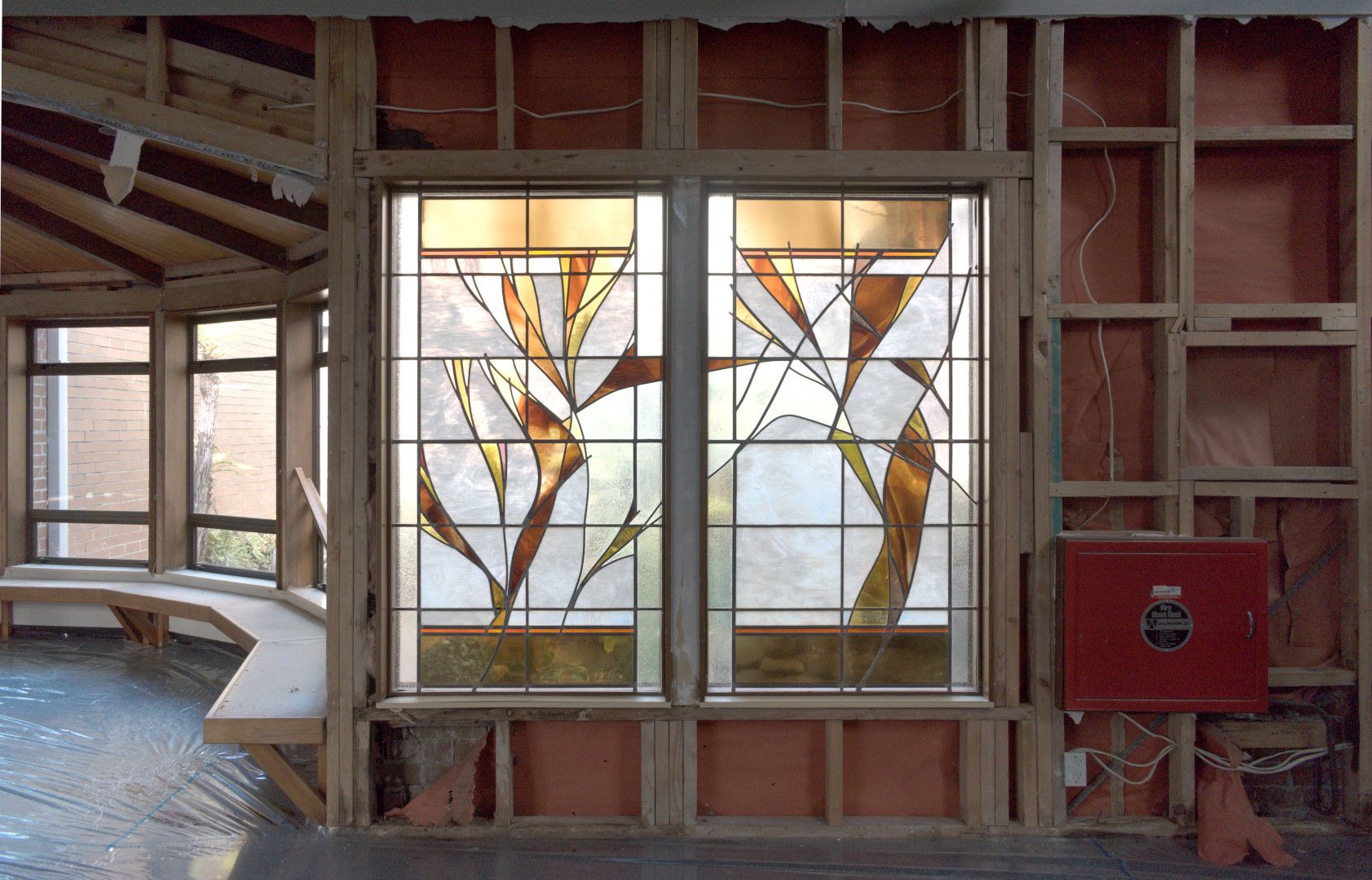 The stained glass window is installed in the window of the Gore Public Library. It was commissioned in memory of Ian Gilchrist, former Director of Parks in Gore, upon his retirement. The window depicts a rural scene and is set in a wall which looks out on a small water feature and garden. The work consists of two identically sized windows which are set side by side. The Gore Public Library building is currently closed for redevelopment. There was originally an information panel located alongside the work inside the building but its whereabouts is unknown.